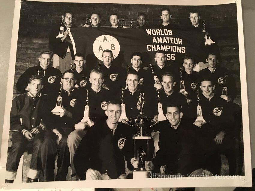 Photo of Stanley Shoeman's 1956 World Amateur Champions baseball team with Stanley Shoeman