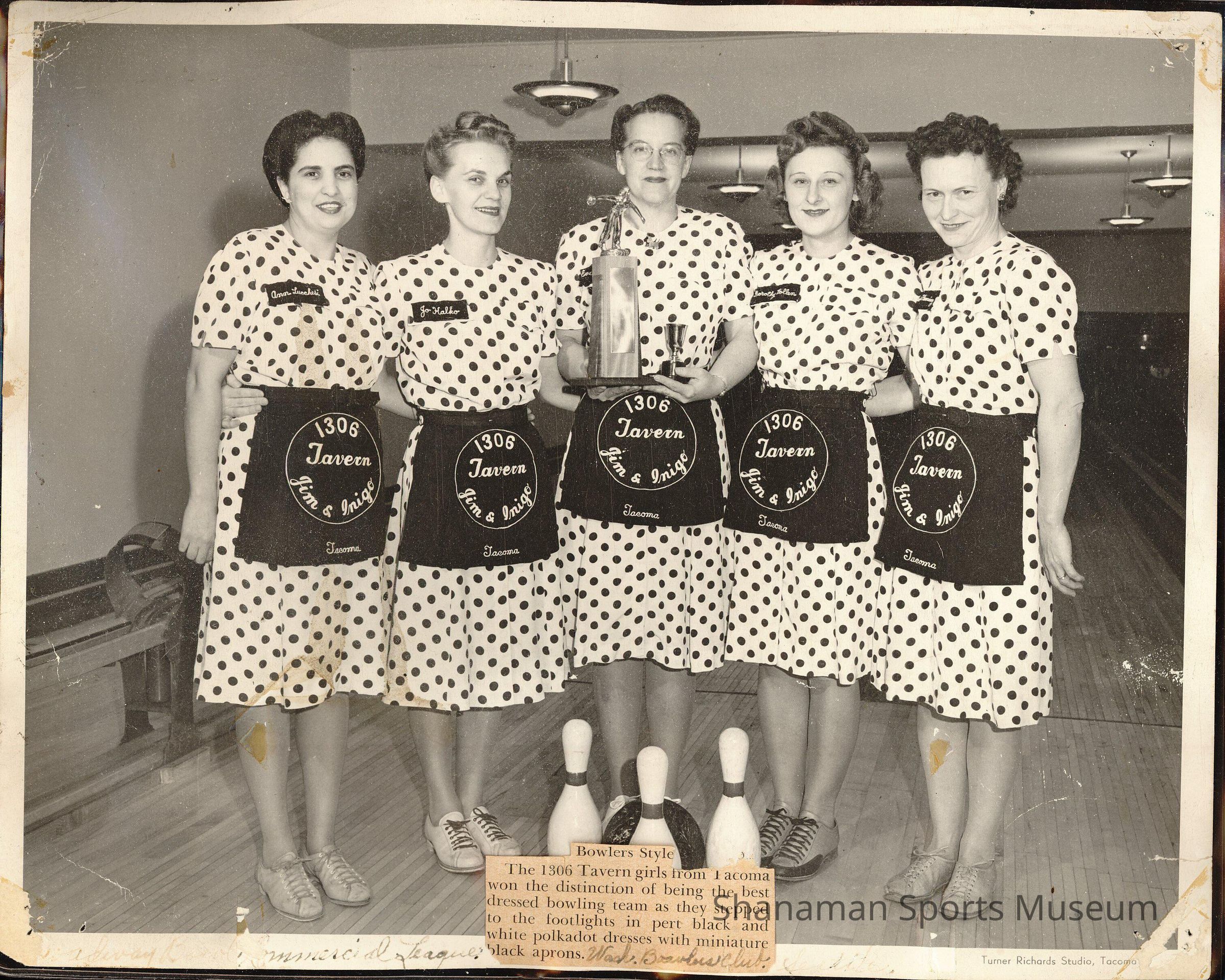 Standing behind three bowling pins and a bowling ball, five women wearing the same dresses as their team “uniforms” played on the 1306 Tavern Team. At the bottom of the picture, there's a newspaper clipping that says “Bowlers Style – the 1306 Tavern girls from Tacoma won the distinction of being the best dressed bowling team as they stepped to the footlights ...” Bowling was a popular sport nationwide for women at the time. In 1917, the Women's International Bowling Congress (WIBC) was formed and it grew into the world's largest sports organization.