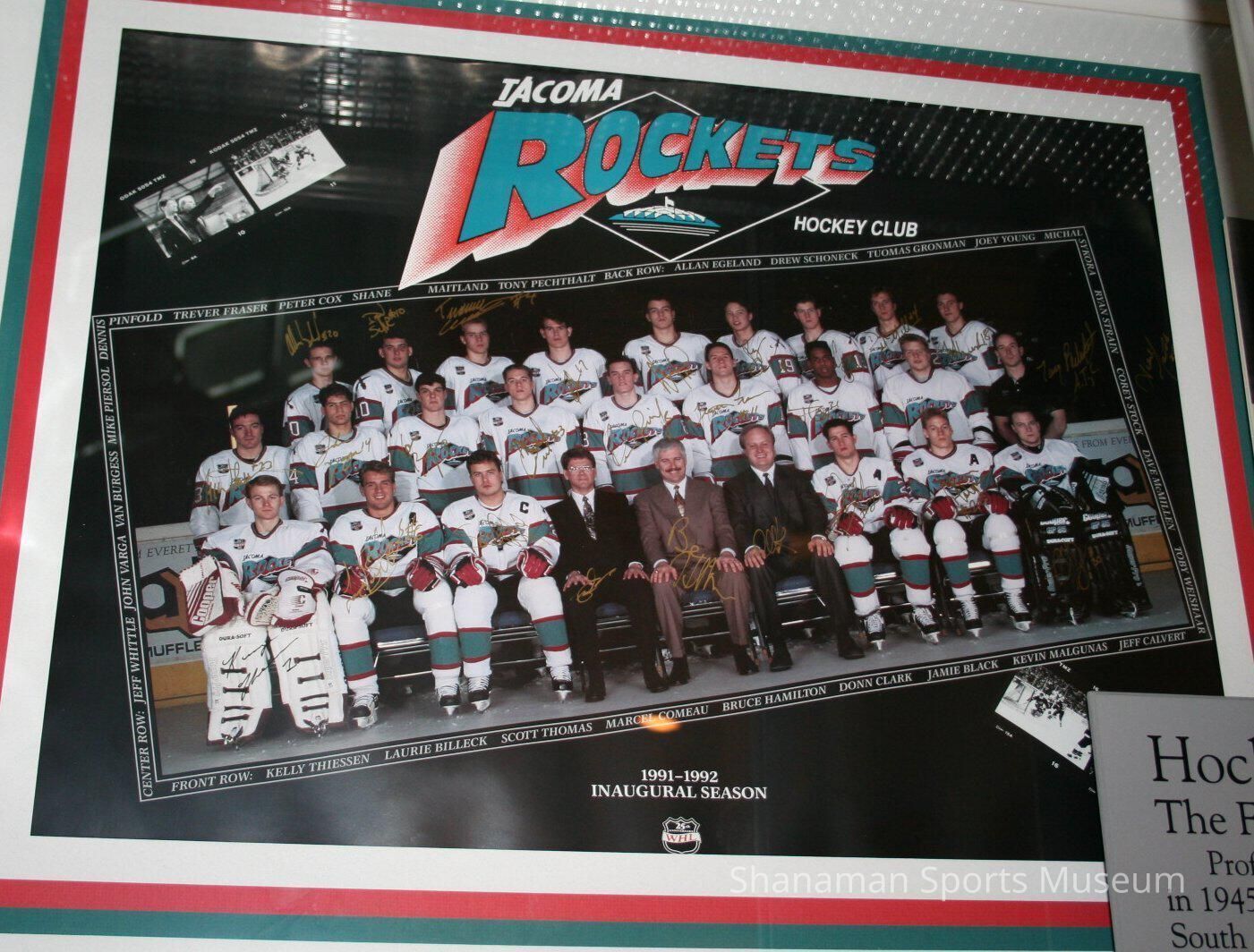 An autographed team photo of the 1991-92 Tacoma Rockets was the inaugural season for the expansion Western Hockey League team. The Rockets played from 1991-95 and started well, averaging the highest per-game attendance for a first-year expansion franchise in the league and then followed with a 24-game home winning streak in the second season. But it didn’t last as the Dome’s cavernous feeling and bad sightlines made it difficult for fans to see the game. The Rockets made the playoffs all four years with their best finish coming in the 1993-94 season, losing in the West Division semi finals. After being eliminated in the first round in the 1994-95 seasons, the Rockets’ low attendance forced the franchise to relocate to Kelowna, B.C., where they currently play.Lexicon