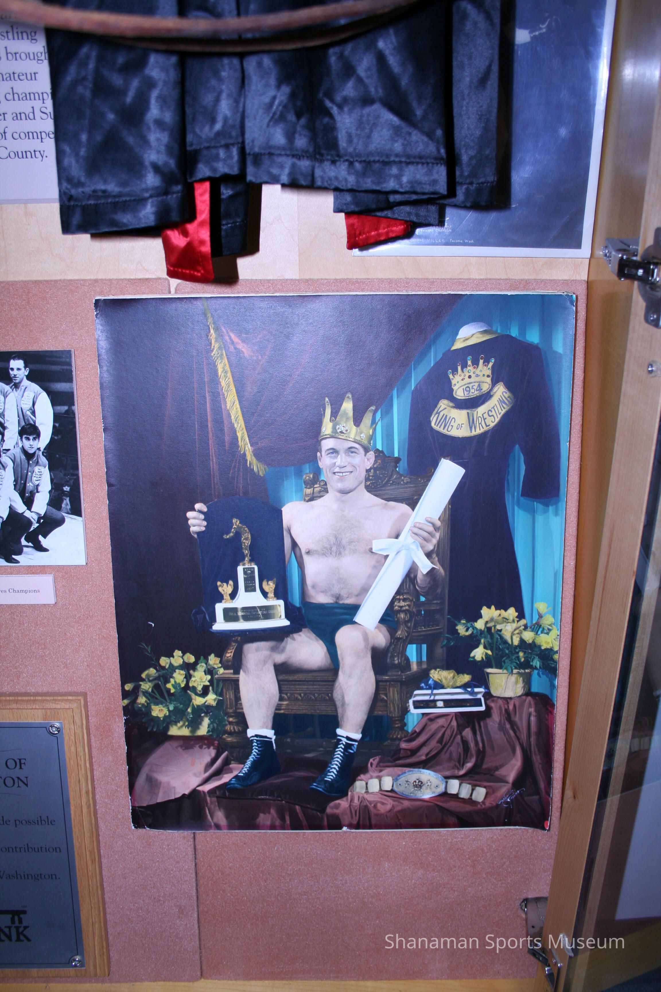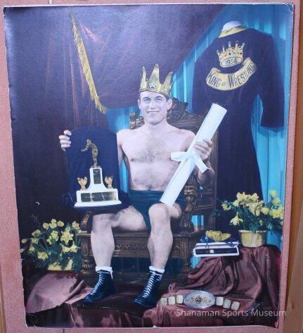 Stojack holds a trophy in his right hand and a robe with "King of Wrestling" and a crown on the back hangs behind Stojack.Lexicon