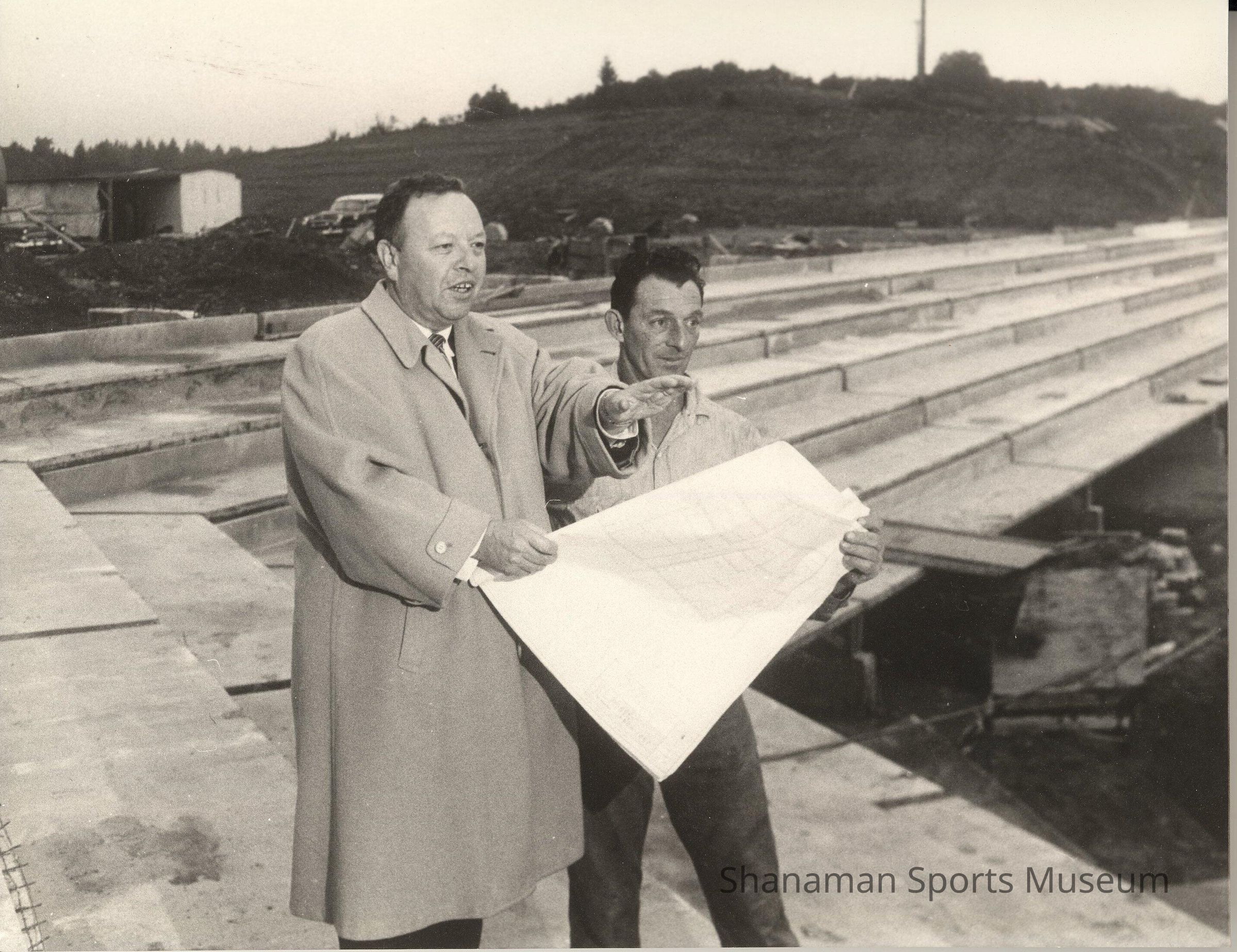 Ben Cheney, a successful businessman and a sports enthusiast, helped build Cheney Stadium, contributing $100,000 to help build the stadium. With a 11% interest in the San Francisco Giants, Cheney helped bring the Triple-A Giants to Tacoma. In this black-and-white photo, Cheney is standing with Hank Vallee during the construction of the stadium named after him. Hank Vallee was the building manager of the stadium project.Made/Created