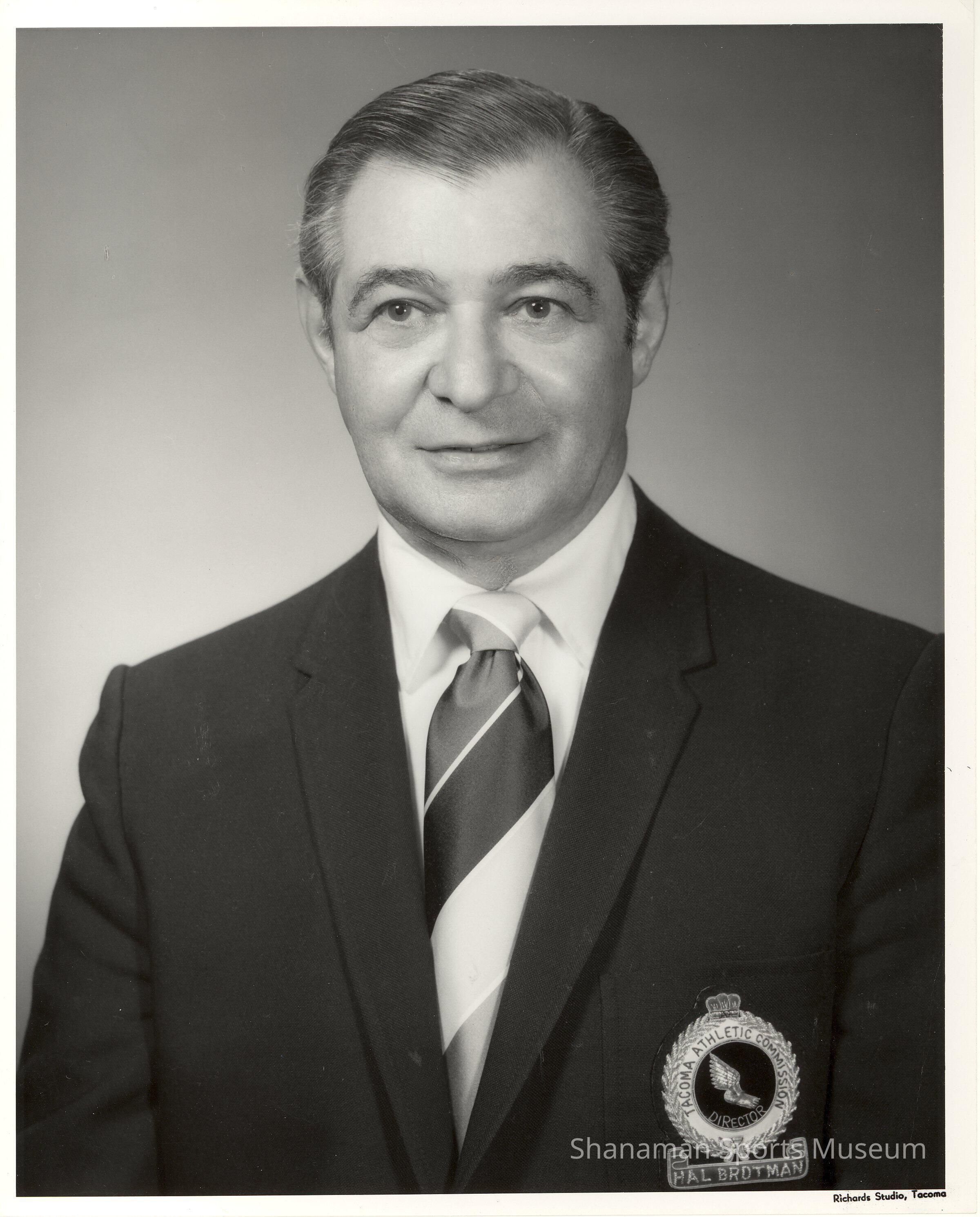 In this black-and-white photo, Hal Brotman wore a dark sports jacket with a TAC patch that has his name on it. As a long-time supporter of the Tacoma Athletic Commission, Brotman was the TAC president in 1970 and 1971. Brotman, who was born and raised in Tacoma, was a co-founder in 1983 of Costco, a Issaquah-based bulk retail chain that grew into a global giant and currently has 736 warehouses around the world. Brotman was also a longtime supporter of sports in Tacoma and back in the 1950s he began encouraging the construction of a sports center in Tacoma. When the mini-dome was built in Tacoma, the Tacoma Athletic Commission held a Morley Brotman night.Lexicon