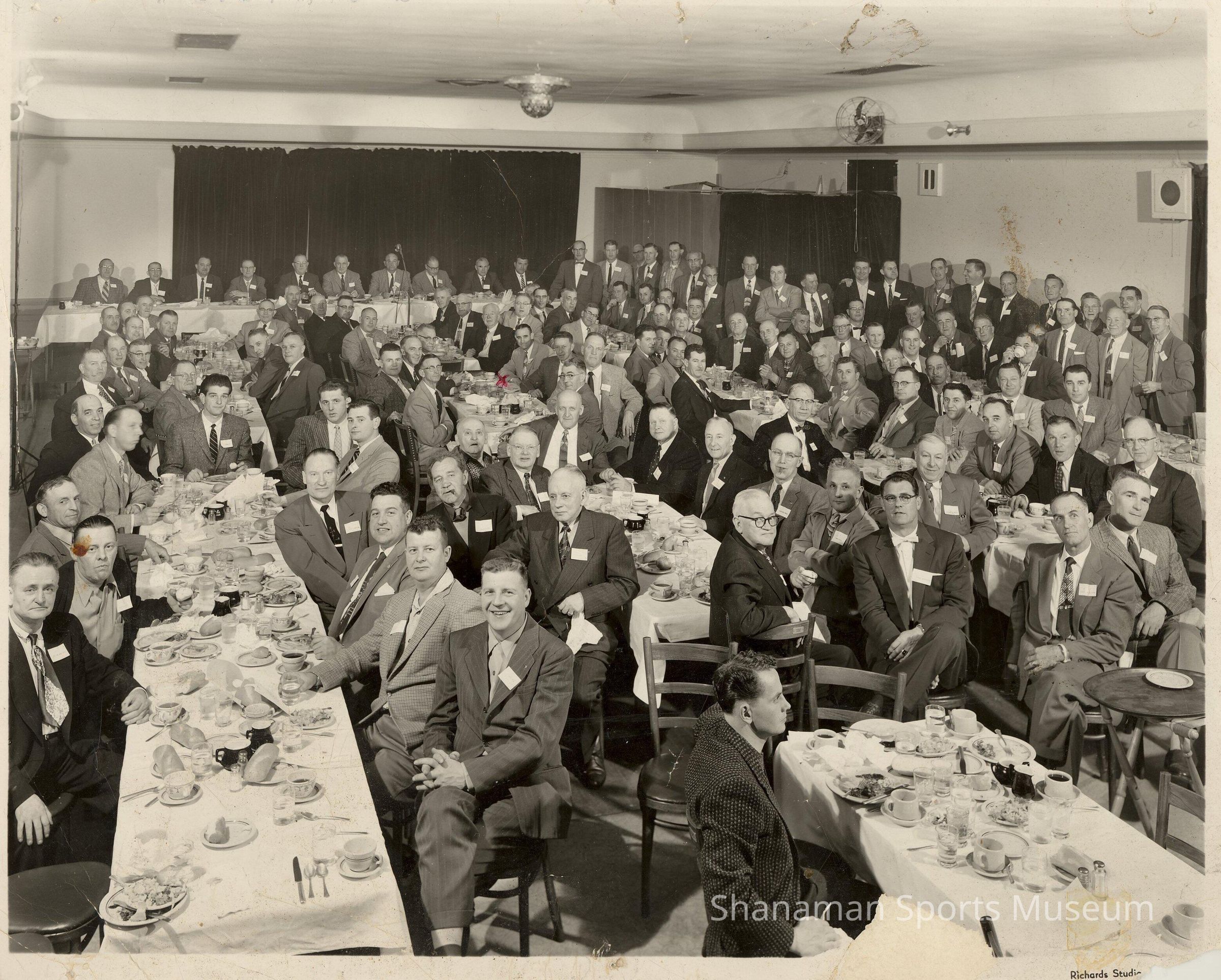A picture of the banquet hall patrons during a Old-Timers Baseball-Softball Association banquet held on April 5, 1957. Many of the men pictured had either played, coached or done both over their careers. The Old-Timers Softball-Baseball Association was conceived as a way to recognize the sports and their participants from the area.Lexicon