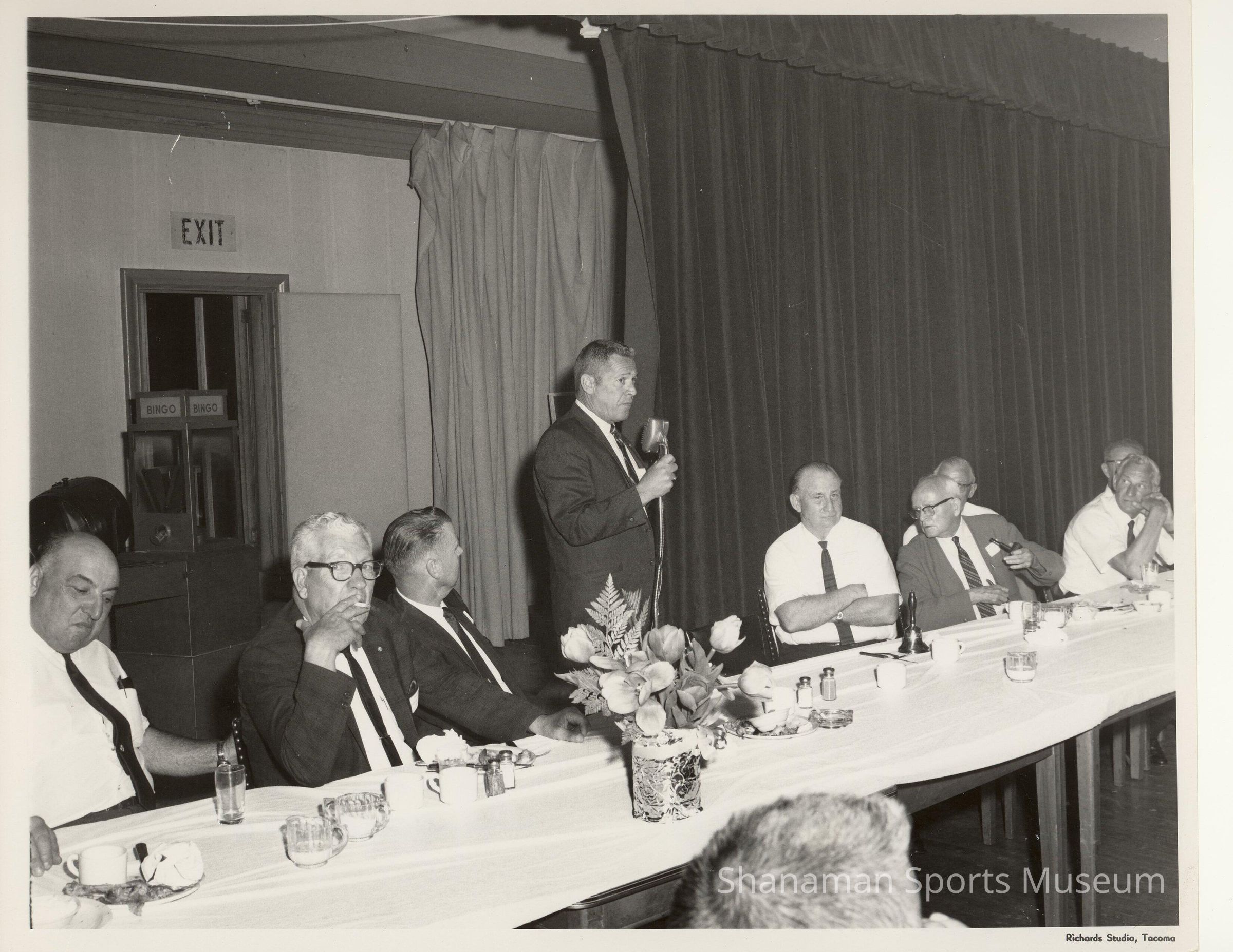 Standing at the head banquet table, Bobby Adams, general manager of the Tacoma Giants, speaks at a community gathering. Before becoming the Tacoma Giants general manager, he played 14 years in the major leagues from 1946 to 1959. After his playing career and after coaching with the Chicago Cubs, he was named the club president of the Triple-A Tacoma Cubs of the Pacific Coast League. Adams' six-year tenure in Tacoma ended in 1971 when Chicago moved its Triple-A team to Wichita, Kansas.Lexicon