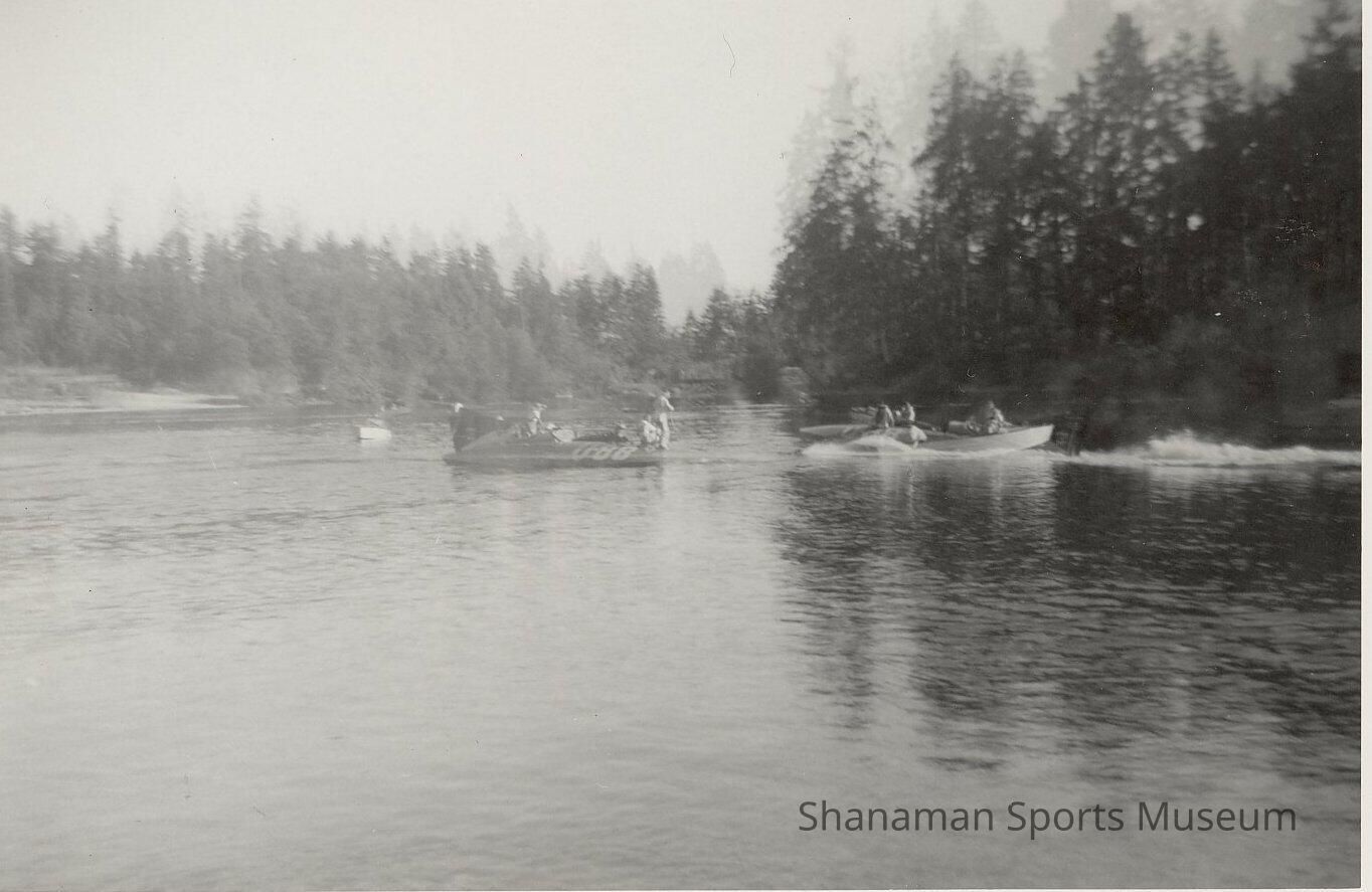 The hydroplane Miss B & I goes through a test run on American Lake near Tacoma. The U88 boat is visible to the left with the crew standing on her fore deck. A second assist boat makes a large wake to the right in this photo donated by crew member Ed Longozo. The Miss B & I was a popular unlimited hydro from Tacoma. Driven, designed and owned by Bob Gilliam in 1956, the boat was the winner of the Copper Cup race in Montana. Driving the Miss B & I in almost total darkness during an after-hours test run, Gilliam ran over the log boom in the boat. Gilliam, who came to Tacoma via the Army and was stationed at Fort Lewis, earned a win in the 1961 Seafair Queen’s Trophy race. Gilliam may not have been the best boat driver, but his boatbuilding skill was unmatched. Gilliam’s team, which raced under the moniker “Fascination” when there wasn’t a sponsor available, reached financial backing from Seattle radio station KOL and raced as KOLroy in 1959-60.