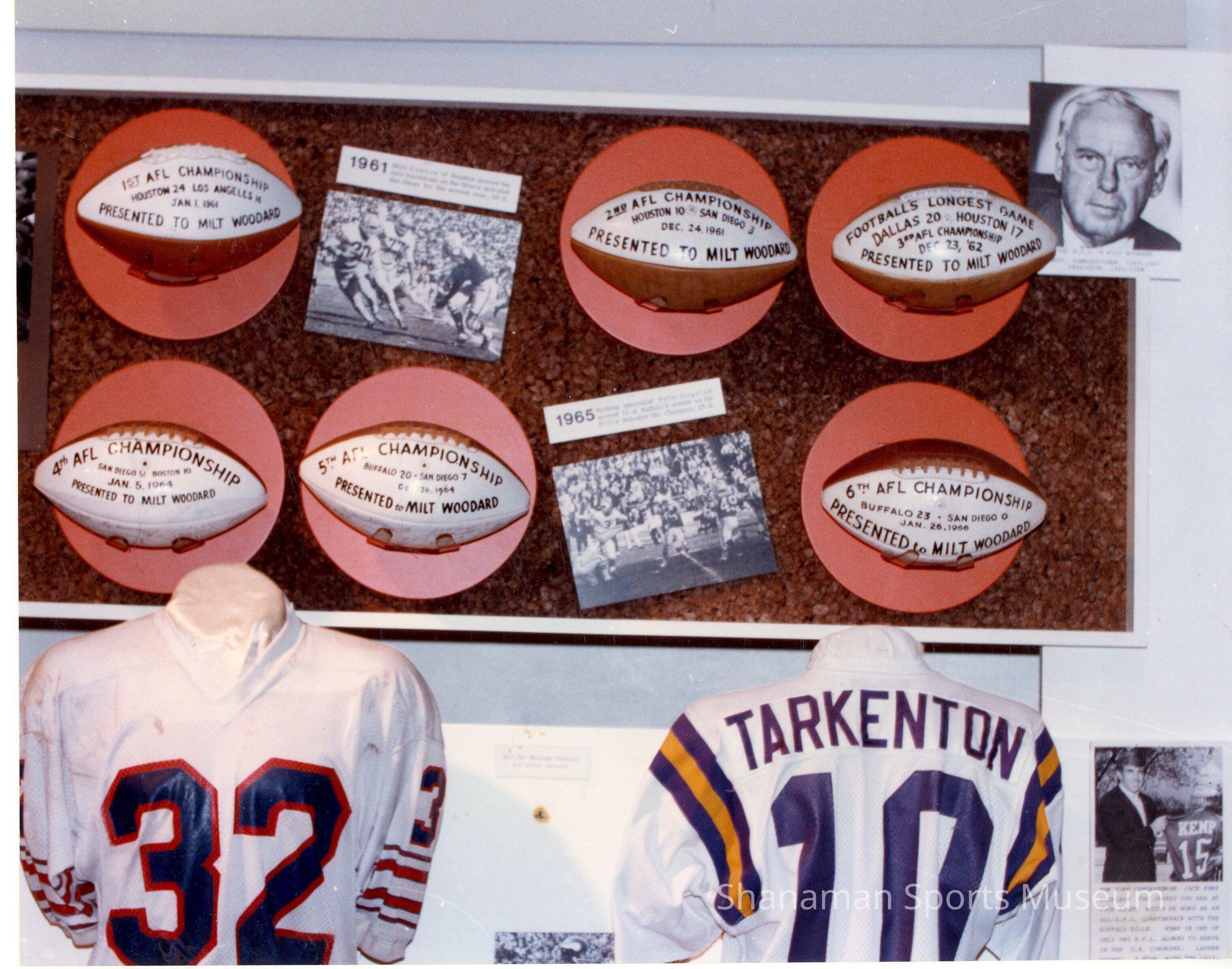 Here is a color photo of the AFL championship footballs. The photo was donated by Tacoma's Milt Woodard, who was appointed the president of the AFL in July 1966. His appointment came after the NFL and AFL agreed to merge. Woodard, a graduate of Tacoma's Stadium High School, served as the AFL president until the merger was finalized in March 1970. In 1989, Woodard was inducted into the Washington Sports Hall of Fame. Woodard served as the AFL president from July 1966 to March 1970, succeeding commissioner Al Davis as the chief executive of the league. After playing football and running track at Stadium, Woodward attended the College of Puget Sound and played baseball, graduating in 1933. His distinguished career as a sportswriter with the Tacoma News Tribune and the Chicago Sun-Times followed.Lexicon