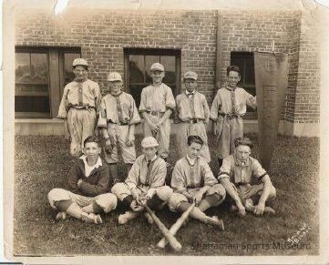 Milt Woodard (back row, right) holds a banner in a team photograph with eight teammates on the Franklin grammar school baseball team.