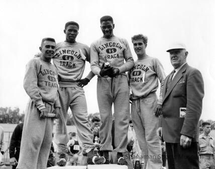 Members of the 1954 Lincoln High School track relay team, including Luther Carr and Vic Eshpeter, pose with coach John Sharp, right.