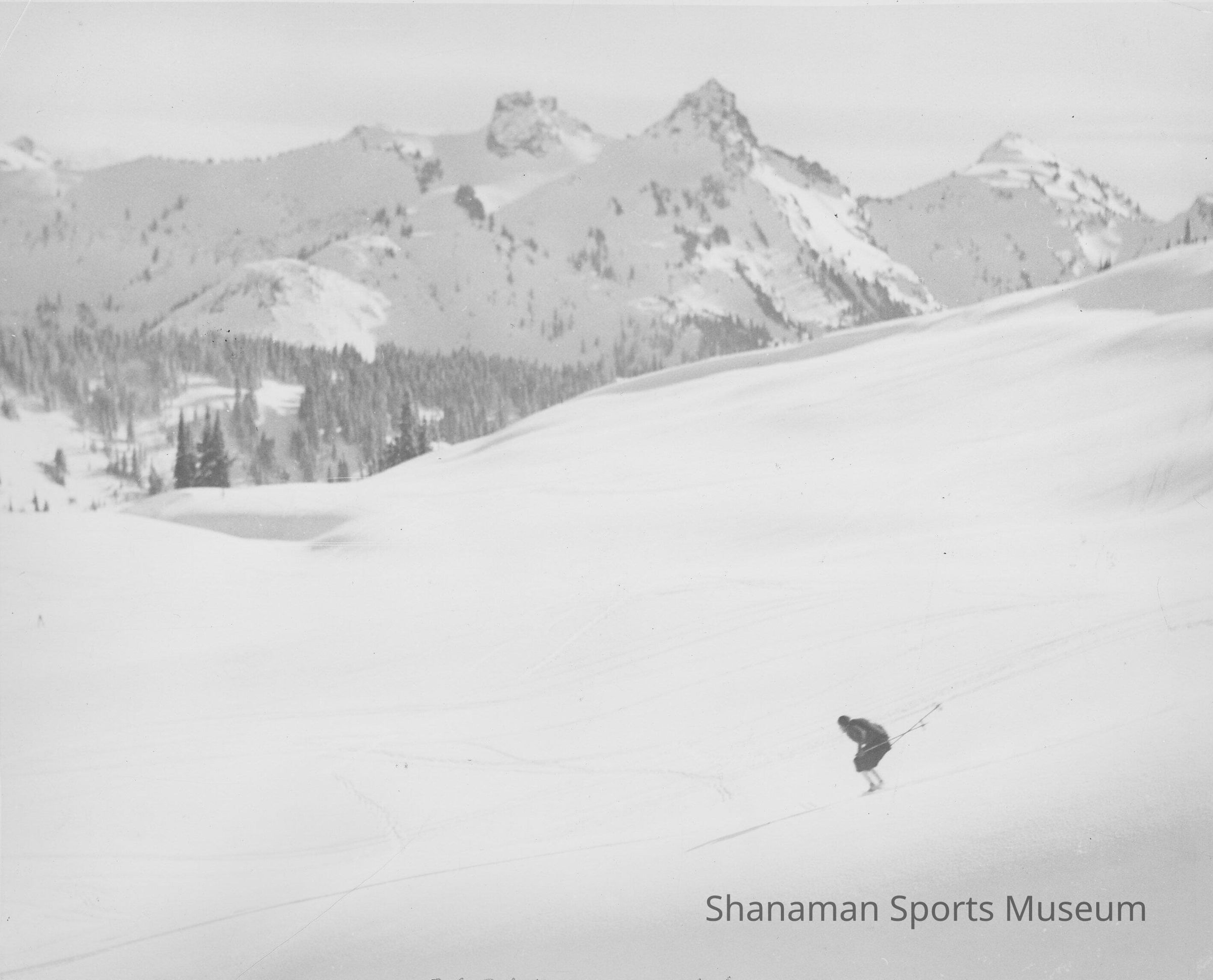 A skier rips down the Paradise Glacier at Mount Rainier National Park in 1934. The glacier, which has receded significantly since this image was taken, offered a unique opportunity for skiers. Reflection Lakes and the Tatoosh Ranger are visible in the background. Paradise is still a popular destination for backcountry skiers looking to avoid the crowds (and comforts) of ski resorts.Lexicon