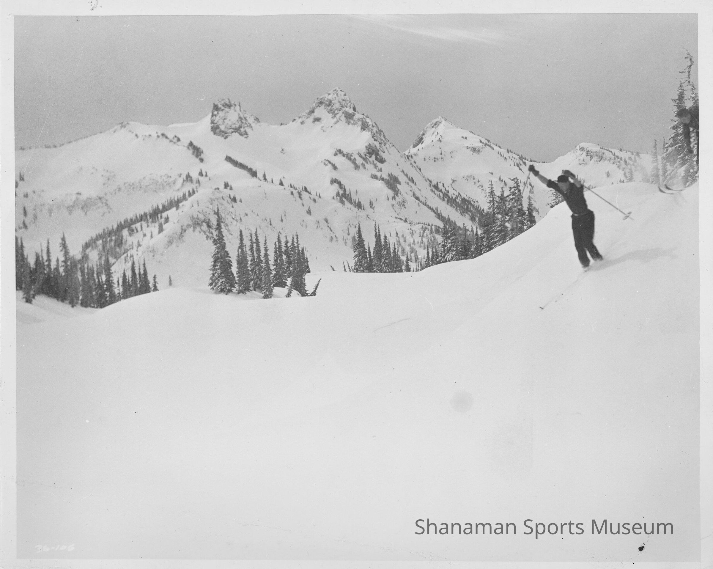 A skier excitedly takes on the Devil’s Dip between Paradise and Narada Falls. In years when the park opened the road between the falls parking lot and Paradise, it was a short drive between the two destinations. However, for many years the road was closed beyond Narada Falls leaving skiers to make their own to Paradise and enjoy the extra skiing on the way back.Made/Created