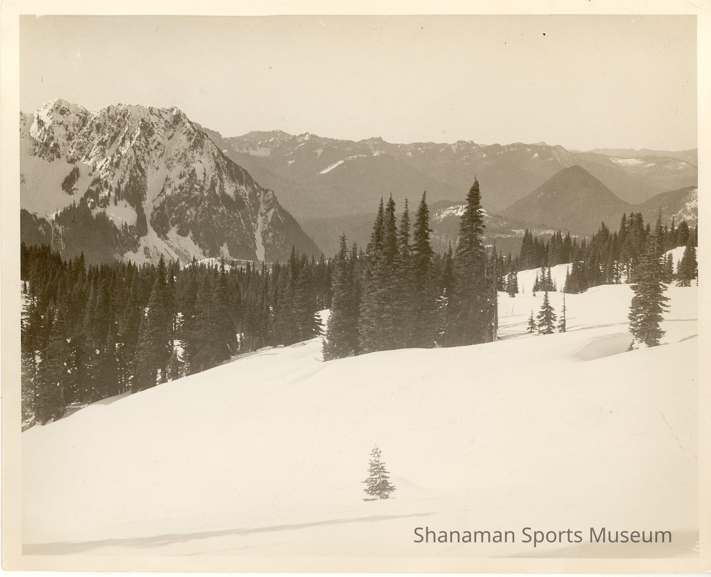 Eagle Peak (left) and tree-covered Mount Tum Tum (right) are visible from the snowy slopes at Paradise, where skiers once flocked to play on the slopes. Located in Mount Rainier National Park, Paradise was home to temporary rope tows from the 1930s to 1950s. On Dec. 5, 1937, the opening of the rope tows drew more than 2,300 skiers to Paradise.Made/Created