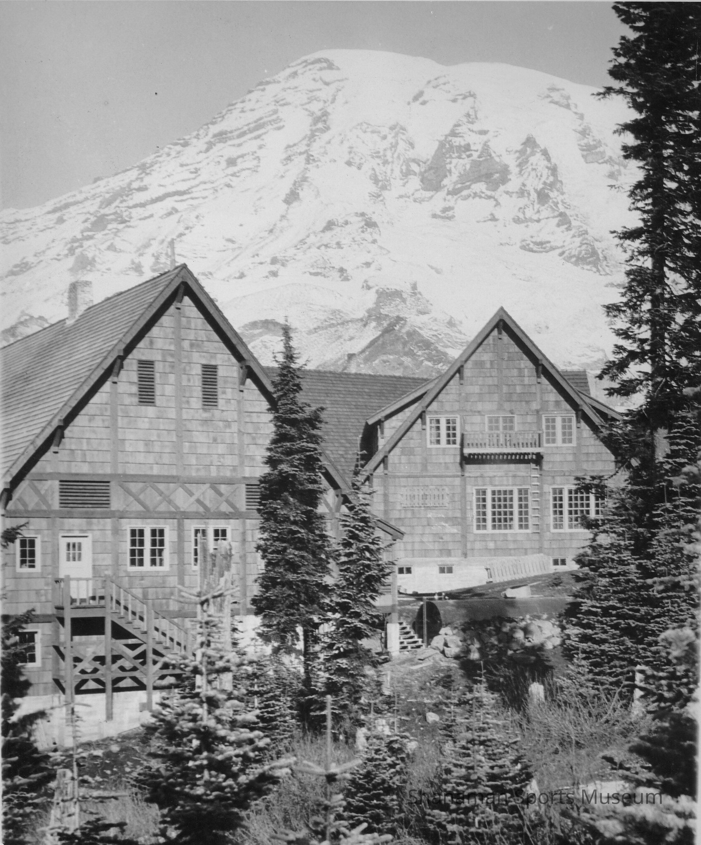 With Mount Rainier as the backdrop, here is a black-and-white photo of Paradise Lodge that was taken in the mid 1930s. In 1916, the 121-room Paradise Lodge was built, just a year after a 27-mile road was constructed through the woods and the inn opened in 1917. President Truman visited Paradise Lodge in 1945 and he played the piano that is still in the lodge. Paradise is the starting point for most of the 10,000 hikers who attempt to climb Mount Rainier each year.Made/Created