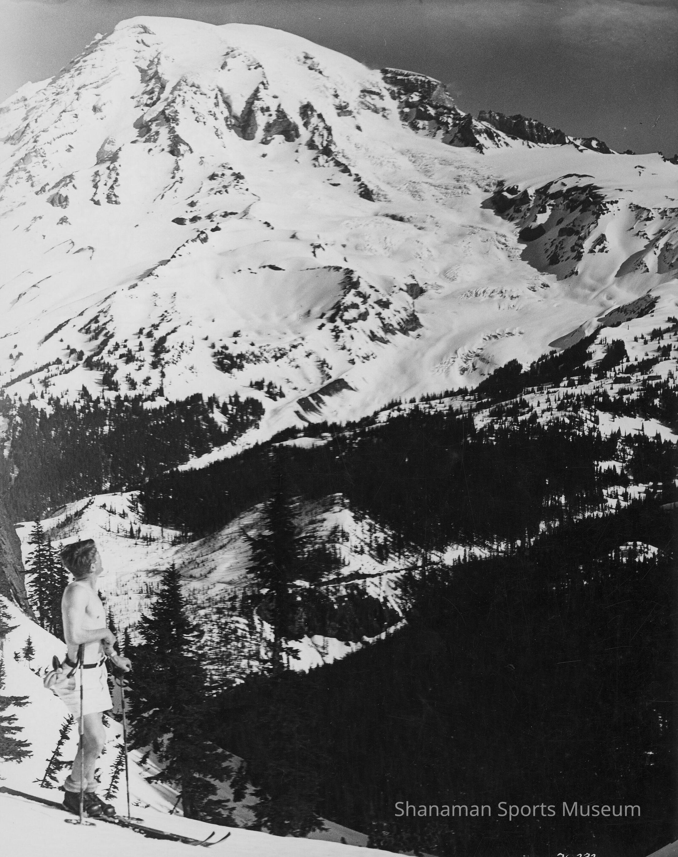 A skier who had skied to the side of Pinnacle Peak looks at a beautiful view of Mount Rainier in this photo. Pinnacle Peak loop trail is a 3-mile hike that is moderate in trail traffic. Pinnacle Peak is in the middle of the Tatoosh Range at an elevation of 6,562 feet. It is the second highest peak on that range. Mount Rainier, at 14,500 feet, is a popular peak for climbers and about 10,000 climbers sign up to climb Mount Rainier each year. Pinnacle Peak is the signature peak of the Tatoosh Range, a small range just to the south of Mount Rainier.Made/Created