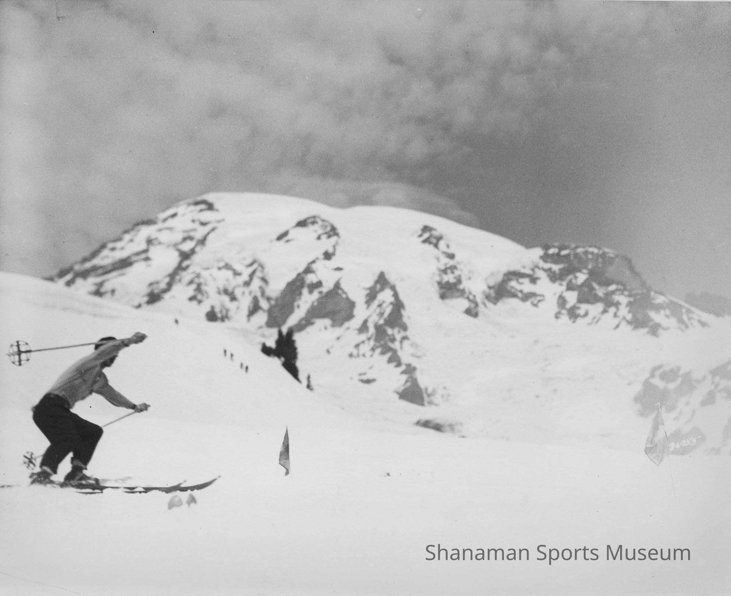 Mount Rainier rises above Paradise where skiers often visited to play on the slopes. The famous Silver Skis Race saw skiers hike to Camp Muir (Not visible, but located to the far right in this image) then race back to Paradise. The first race was in 1934. Skiing historian Lowell Skoog called it “the wildest ski race ever held in North America.”Lexicon