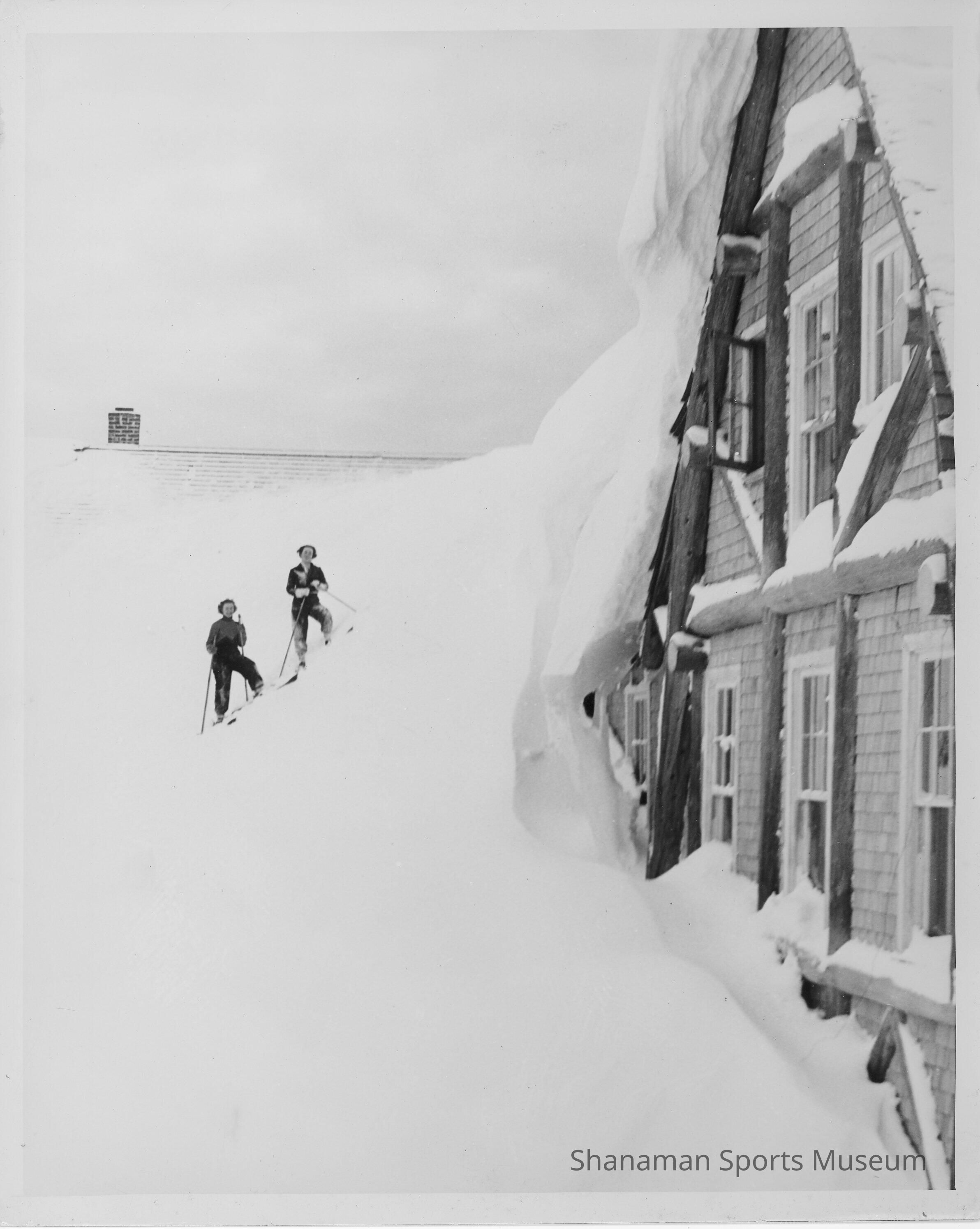 Two skiers pause for a photo of them skiing down the steep and snowy roof of Paradise Inn. Paradise is a year-around attraction, drawing hikers during the summer to hike through the valley hillside filled with flowers and then during the winter when the slopes are covered by snow. Paradise, which was built in 1916 and opened in 1917, averages about 700-inches of snow a year. In 1936, a rope tow for skiers at Paradise was built. The photo was donated by Merit Cookingham.Made/Created