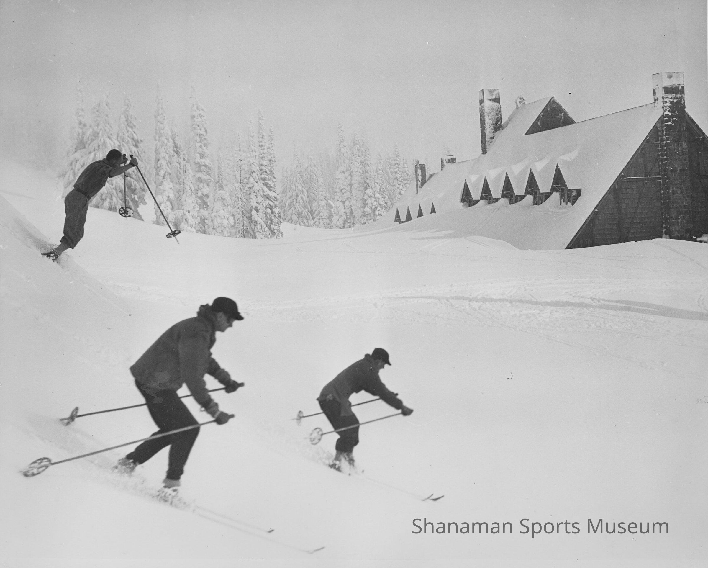 With a snow-covered Paradise Lodge in the background, three skiers speed down the slope by the hotel, having fun as they go. Paradise Lodge opened in 1917 and was originally planned to be built at Longmire. But plans were changed and the 150-room hotel was built at Paradise at 5,500 feet. The hotel today is a popular starting point for the 10,000 climbers who attempt to climb the 14,500-foot Mount Rainier each year. In 2006, the hotel was closed for two years for some major renovations that cost $30 million. President Truman visited Paradise Inn in June 1945.Made/Created