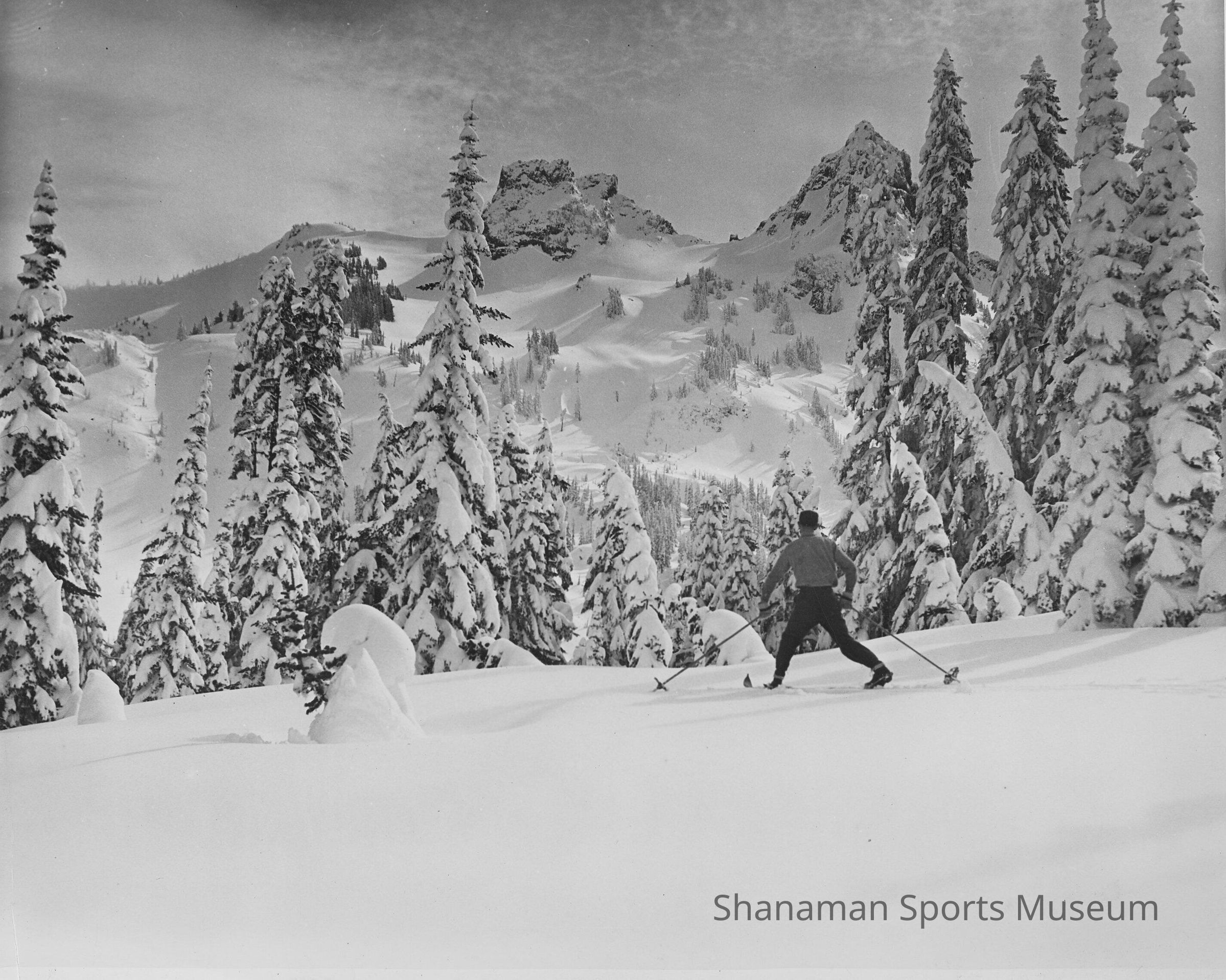 A telemark skier explores the terrain around Paradise at Mount Rainier National Park while the Tatoosh Range provides a stunning backdrop. Nordic skis and bindings allow skiers to travel around more freely than traditional alpine bindings. Paradise was Washington’s first skiing destination and still draws hundreds of skiers, sledders and snowshoers on winter weekends.Lexicon