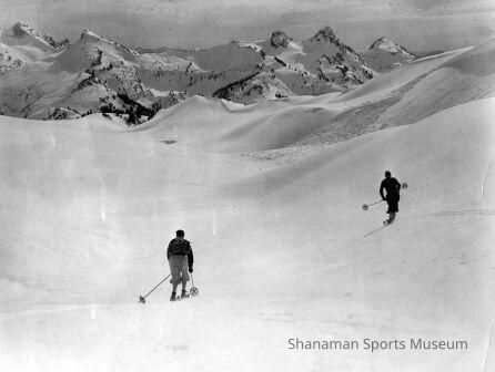 Two skiers cruise across the Paradise Glacier toward the Tatoosh mountains. A short hike from Paradise in Mount Rainier National Park gave visitors an array of skiing opportunities. For more than a century Rainier has lured adventurous skiers. The Paradise Glacier has receded significantly since this picture was taken, but the Paradise area can usually be counted on to receive more snow than most of Washington’s ski resorts. The National Park Service calls Paradise “one of the snowiest places on Earth where snowfall is measured regularly,” but most visit in the summertime when trails and it’s wildflower meadows are mostly snowfree.Made/Created