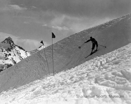 A skier swooshes down a slalom course on the east side of Alta Vista, a hill above Paradise at Mount Rainier National Park. A rope tow on Alta Vista (installed by Tacoma’s Jim Parker and Chauncey Griggs) hauled about 250 skiers per hour up about 300 feet. Skiers paid 10 cents per ride or $1 for the day. The lift (powered by a car engine) was removed each spring. By 1962, the park and many others stopped allowing lifts. Today only two national parks - Yosemite and Olympic - still have lift-serviced skiing.