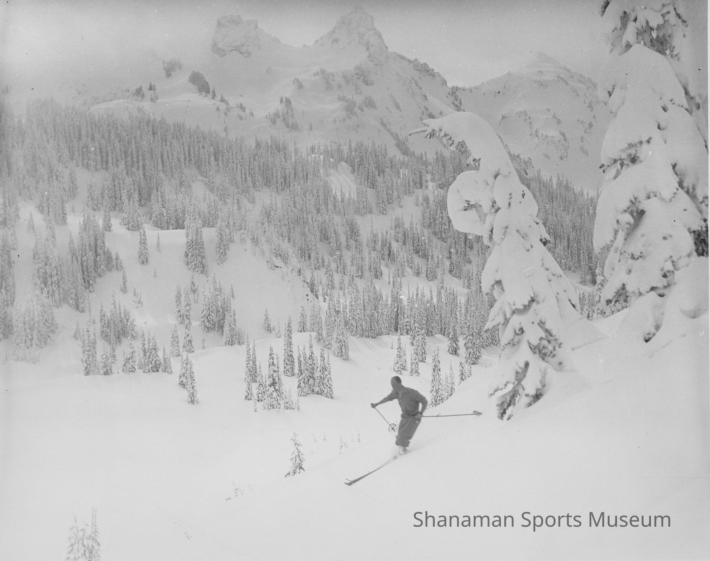 Ken Syverson deftly maneuvers along the slopes at Paradise in Mount Rainier National Park. Syverson was a talented skier who was the lead instructor at Hyak on Snoqualmie Pass in the late 1930s and ‘40s. Syverson was an assistant under Otto Lang (who opened the first ski school at Mount Rainier in the 1930s) and become one of the Northwest’s most respected instructors.Lexicon