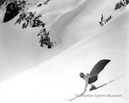 “The Flying Dutchman” zips down a slope at Mount Rainier while participating in the 1936 Flying Kilometer Race. Paradise was the site of many ski races including a ski jumping competition on Alta Vista in 1917 that is believed to be Pierce County’s first snow sports competition.Lexicon