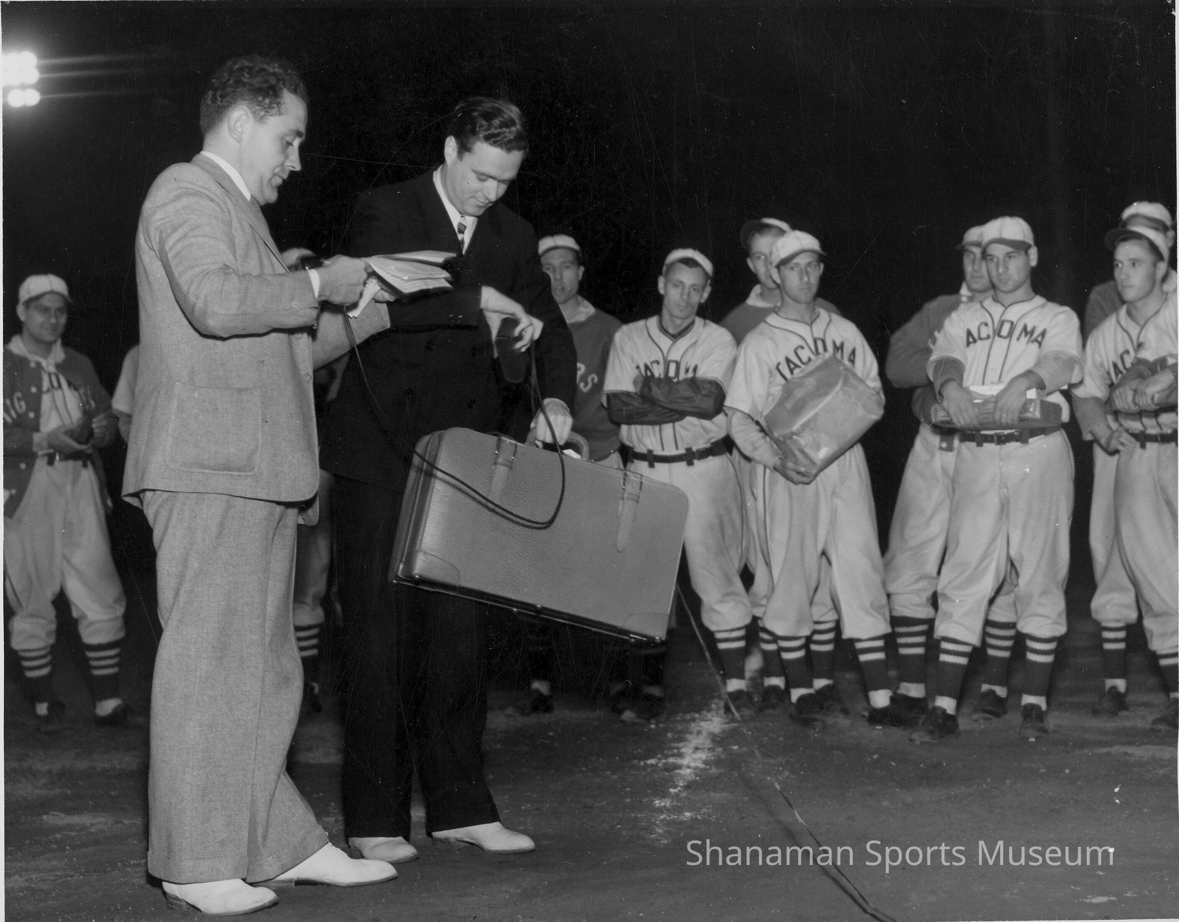 This is a black-and-white photo of the Jerry Geehan Night at the Ballpark, which was a regular event. Geehan, who graduated from Lincoln High school in 1930, was considered to be the dean of radio sports broadcasting in the Tacoma area. After attending the College of Puget Sound for two years, Geehan began broadcasting at KVI Radio in 1932. In 1937, he became the first broadcaster of the Tacoma Tigers baseball games. In 1938, he joined KMO Radio and had a daily sportscast show and did play-by-play for the Pacific Lutheran College and the College of Puget Sound games. Later, he was owner and general manager of KTAC Radio from 1952-69. He was inducted into the Tacoma-Pierce County Sports Hall of Fame in 2005.Lexicon