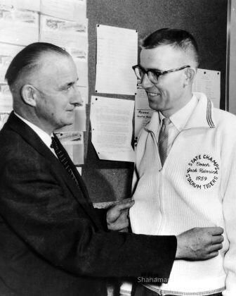 Like father, like son. Legendary coach John Heinrick (left) congratulates son Jack Henrick on coaching the Stadium High School (Tacoma) boys basketball team to the 1959 Class 4A state championship, checking out John's commemorative championship jacket in this photo. John Heinrick coached football at Bellarmine Prep (Tacoma) and then at Stadium, his alma mater. He later coached football and basketball at the University of Puget Sound, where he later became athletic director. He was inducted into the Helms National Association of Intercollegiate Athletics Hall of Fame, Washington State Sports Hall of Fame, Tacoma-Pierce County Sports Hall of Fame, the UPS Athletic Hall of Fame and the WIAA Hall of Fame. Jack Heinrick's 1959 basketball team went 21-3, beating Burlington-Edison 70-50 in the state championship game.Lexicon