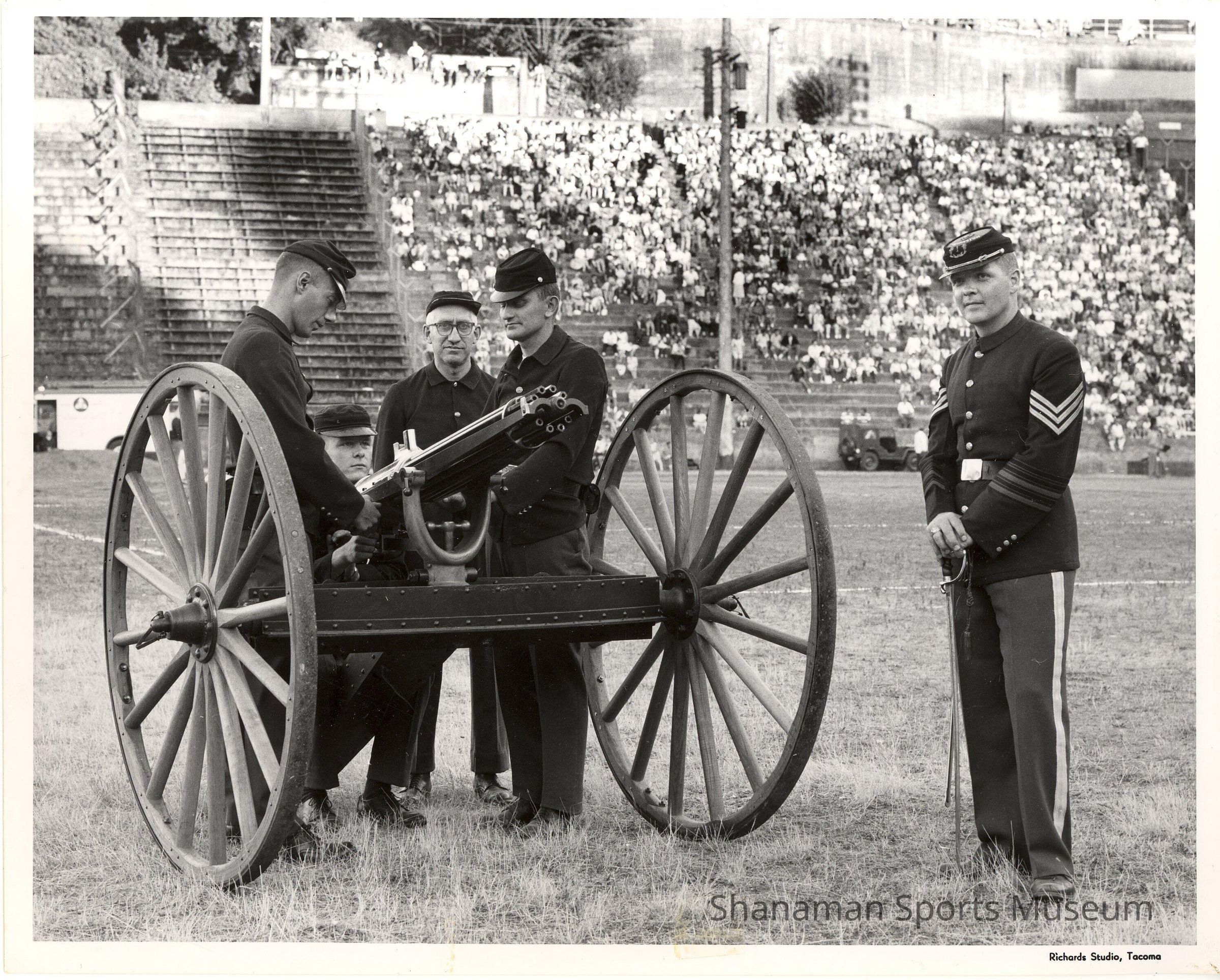 Five men dressed in Civil War-era Union Army uniforms fire a large gun at Stadium Bowl during a Tacoma Athletic Commission fireworks show. The TAC, founded in 1942, sponsored Tacoma’s annual Fourth of July festivities as well as many other events. The TAC remains active in the community.Lexicon
