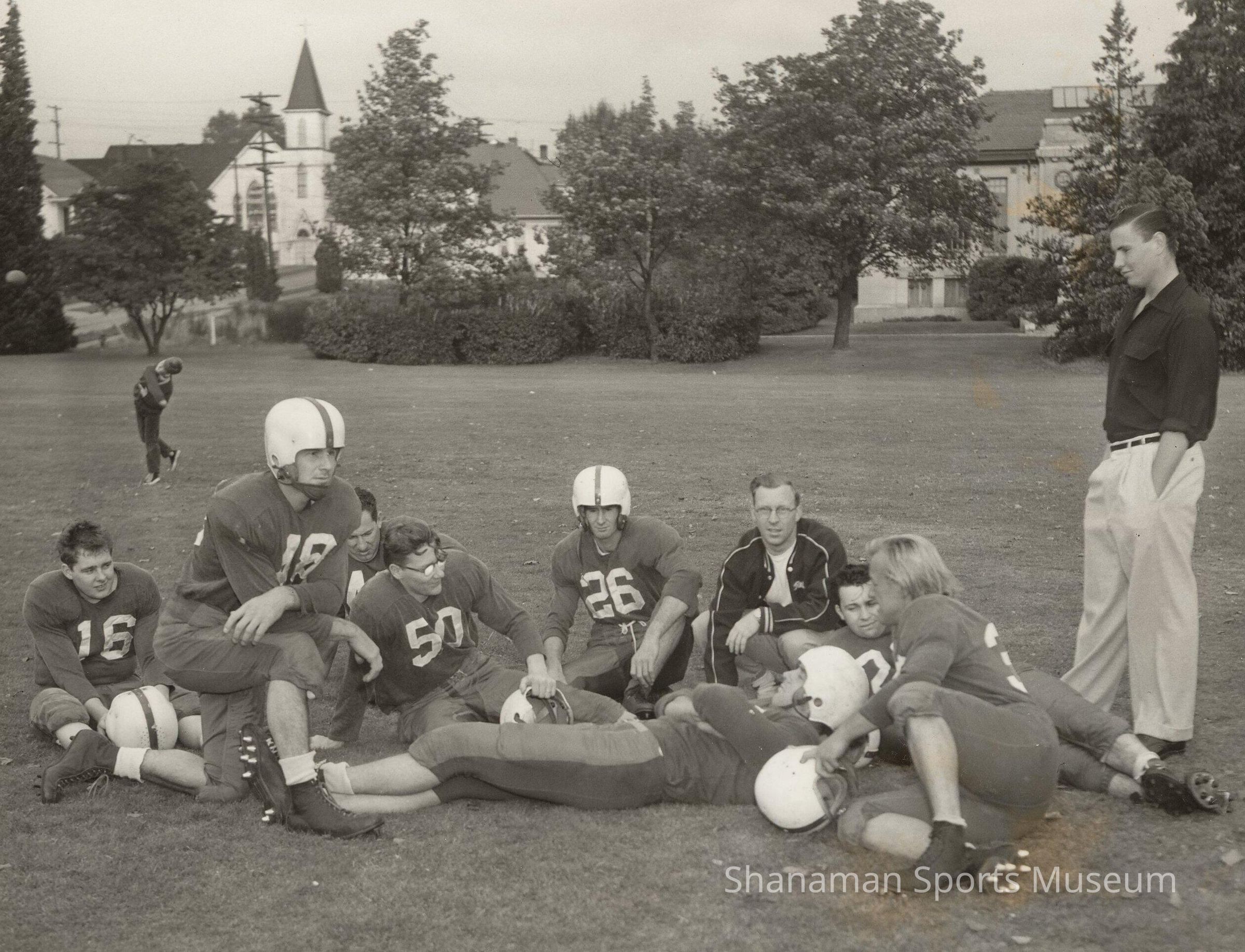 Frank Stojack sits with his teammates before his football practice. Stojack, who grew up in Tacoma, played two years in the NFL with the Brooklyn Dodgers after graduating from Washington State University in the early 1930s. Stojack turned to professional wrestling when his football days were over and during the mid 1950s he was the light heavyweight champion of the world. He was elected to the Tacoma city council in 1953 and he continued to wrestle professionally. He was then elected Pierce County sheriff and he served until 1960s. When he died in 1987, he left $300,000 to the Boys & Girls Club of America. Photo by Associated Press.Lexicon