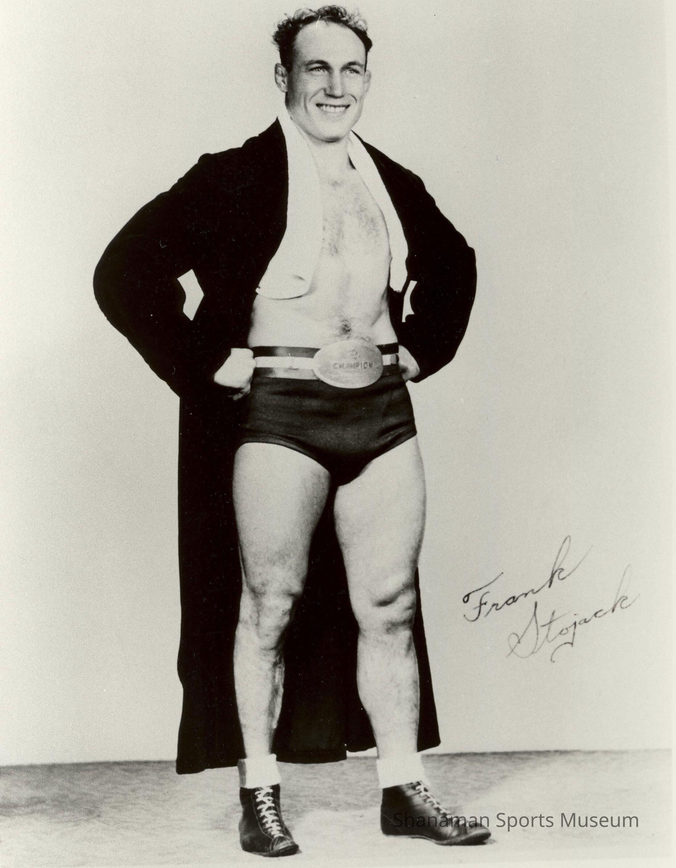Professional wrestler Frank Stojack poses wearing a championship belt and a dark wrestler's robe. Stojack won four Pacific Coast junior heavyweight championships and was the light heavyweight champion of the world from 1953-57.