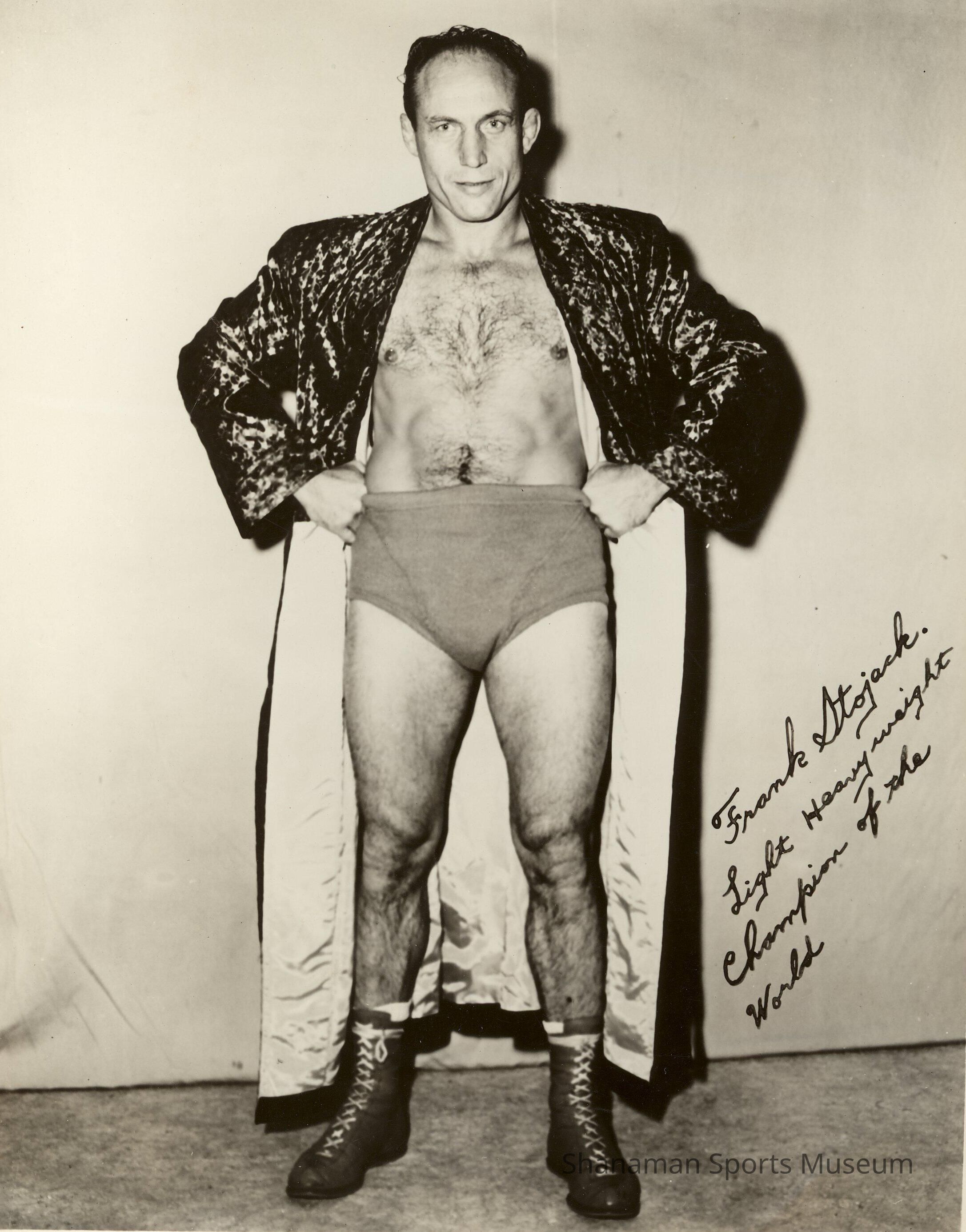 Champion pro wrestler Frank Stojack of Tacoma signed this picture of him posing in his uniform and robe, "Frank Stojack Light Heavyweight Champion of the World."