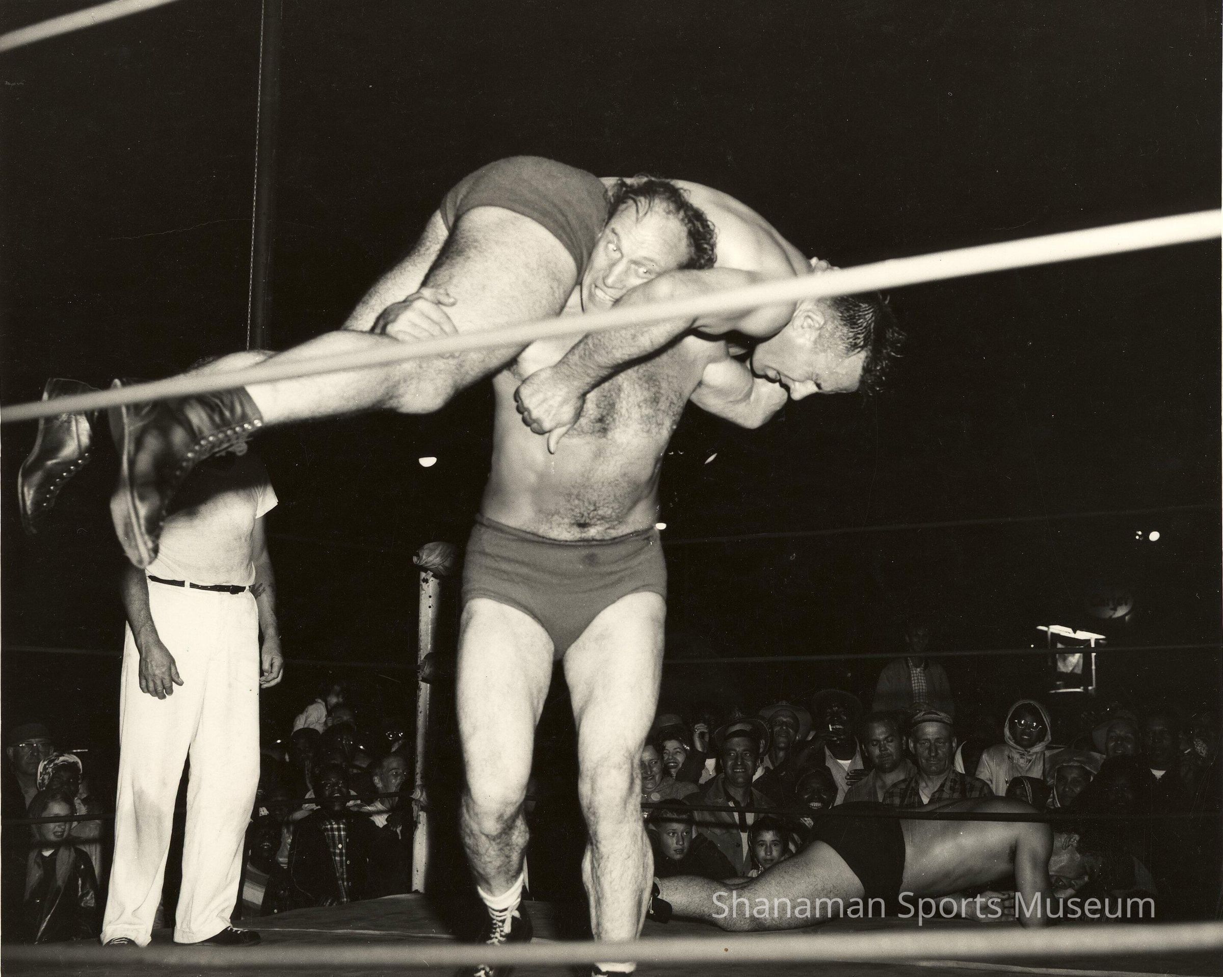 Tacoma pro wrestler Frank Stojack, bottom, executes his famous "airplane spin" move against an unnamed opponent.