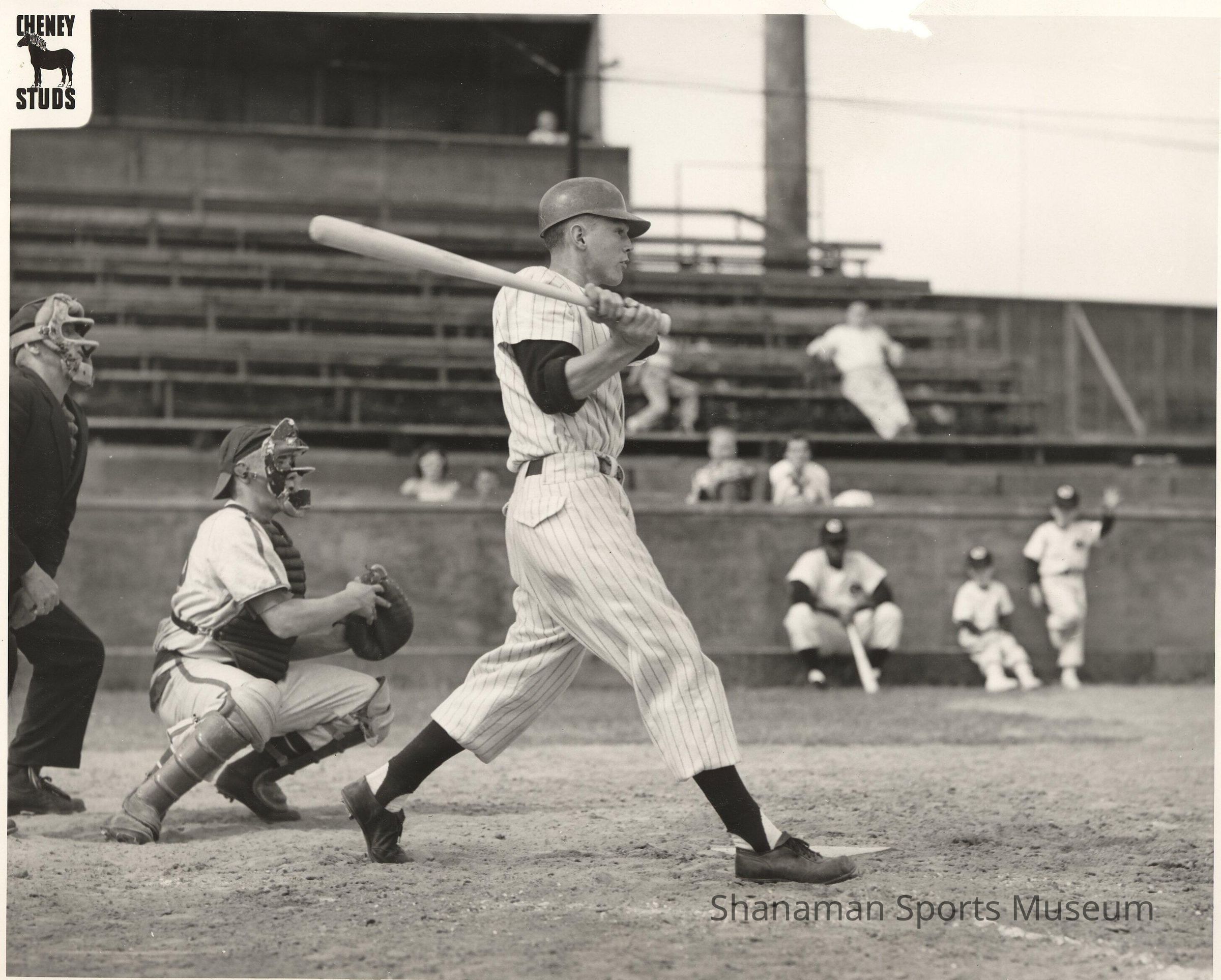 Cheney Stud player Ron Dodge swings while at the plate at Cheney Field. Dodge played for the 1955 Washington Cheney Studs, the 1956 Cheney Studs, and the 1957 Seattle Cheney Studs. In 1959 he played in the Northwest league for the Yakima Bears. He played in 36 games with 89 at-bats and a .225 batting average. He had 20 hits, including one home run. He finished the 1959 season playing for the Seattle Rainiers. He appeared in 43 games with 95 at-bats and a .221 batting average. He had 21 hits including five doubles and a home run. In the mid-1960s, Dodge enlisted in the Navy to become a pilot. He was assigned to VF-51, a fighter squadron attached to the aircraft carrier U.S.S. Hancock. On May 17, 1967, Lt. Dodge's plane was shot down over North Vietnam. A photograph of Dodge in captivity appeared on the cover of LIFE magazine on November 10, 1972 with several articles about prisoners of war in Vietnam. In 1973, the United States negotiated the release of 591 prisoners of war from the North Vietnamese. Cmdr. Dodge (promoted while in captivity) was not released. His remains were turned over to the United States on July 8, 1981.Lexicon