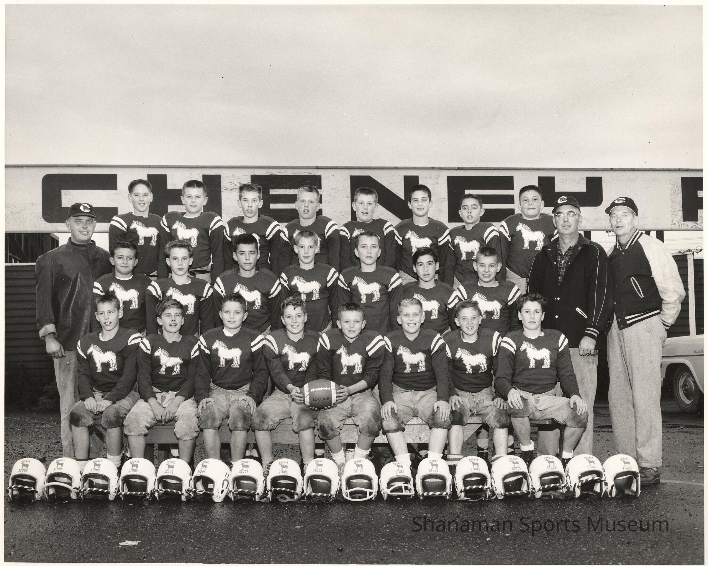 Twenty three youth football players for the Cheney Studs, along with three coaches, pose for a team photograph. The team was sponsored by Cheney Lumber Company, which was founded in 1936 by Brad Cheney. Photo by Richards Studio, Tacoma.Lexicon