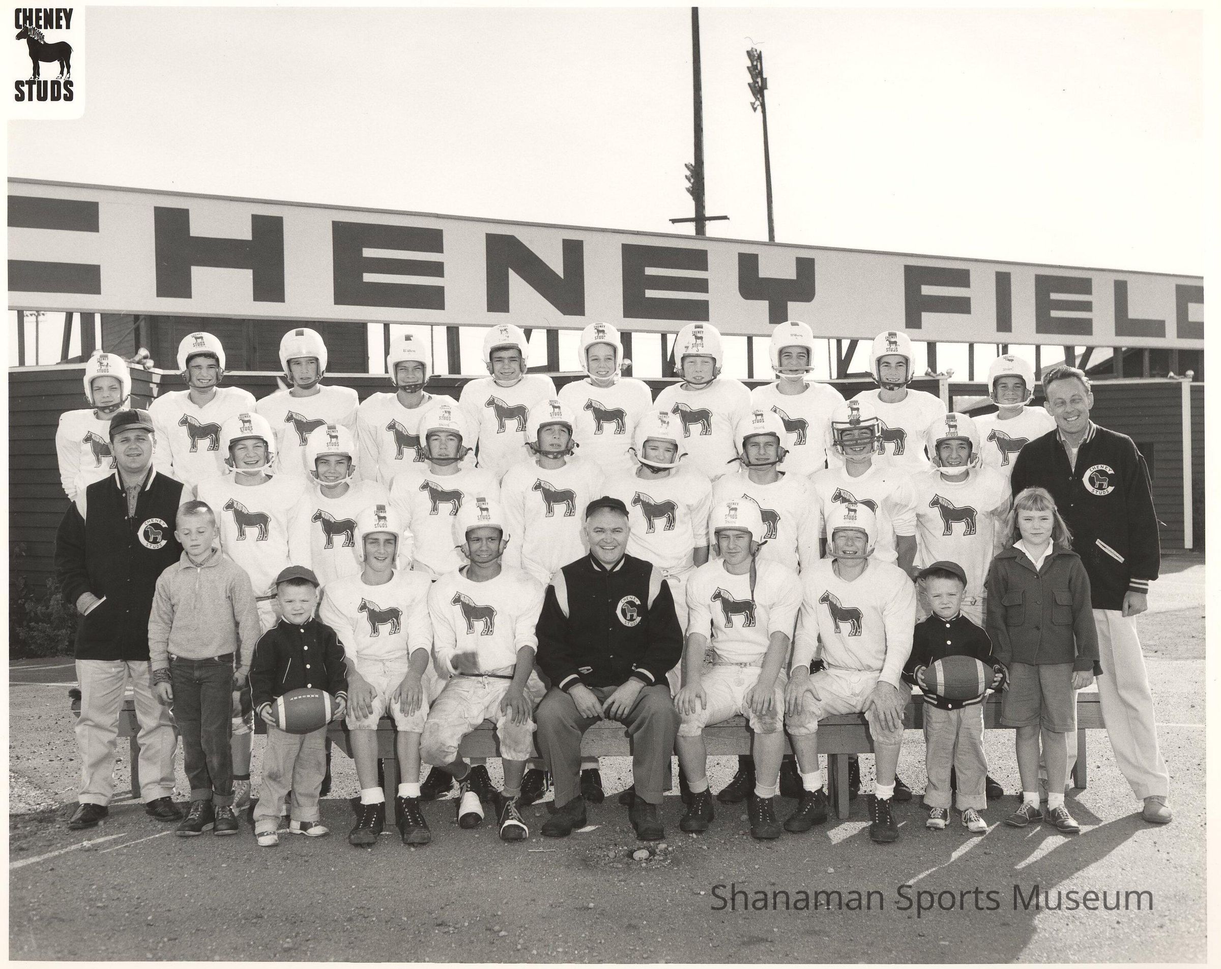 Cheney Studs youth football coach Andy Garnes (front row center) along with Gene Anderson (standing, right) pose with 22 players at Cheney Field. The team was sponsored by Cheney Lumber Company, which was founded in 1936 by Brad Cheney.Lexicon