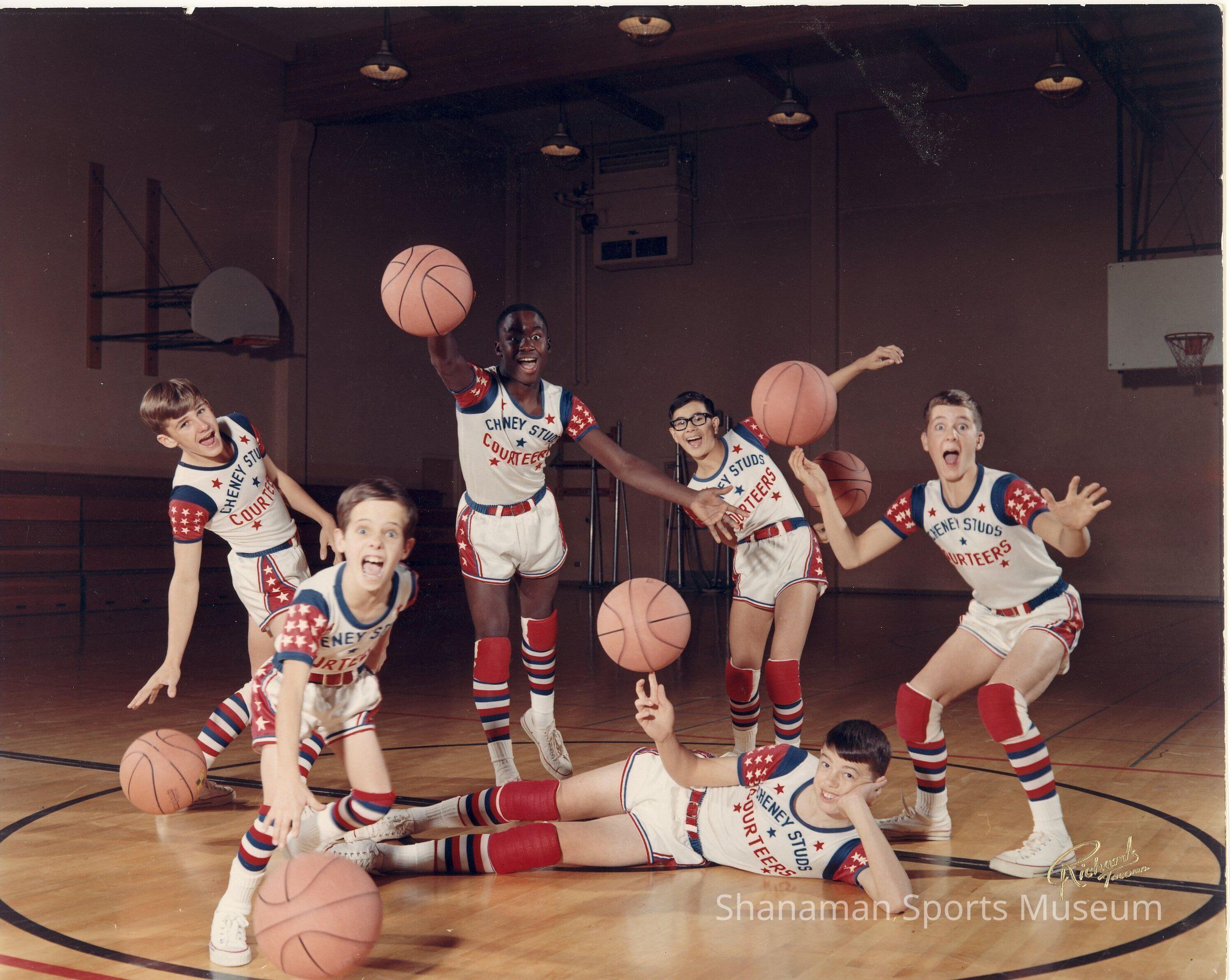 The Cheney Studs Courtiers youth basketball team in a fun photo shoot. The Courtiers were organized by Gene Anderson and the Cheney Lumber Company started the exhibition team where the focus was on entertainment instead of competition. Many of the skills learned by the Courtiers were modeled off of the Harlem Globetrotters where the players became extremely professional in their abilities.Lexicon