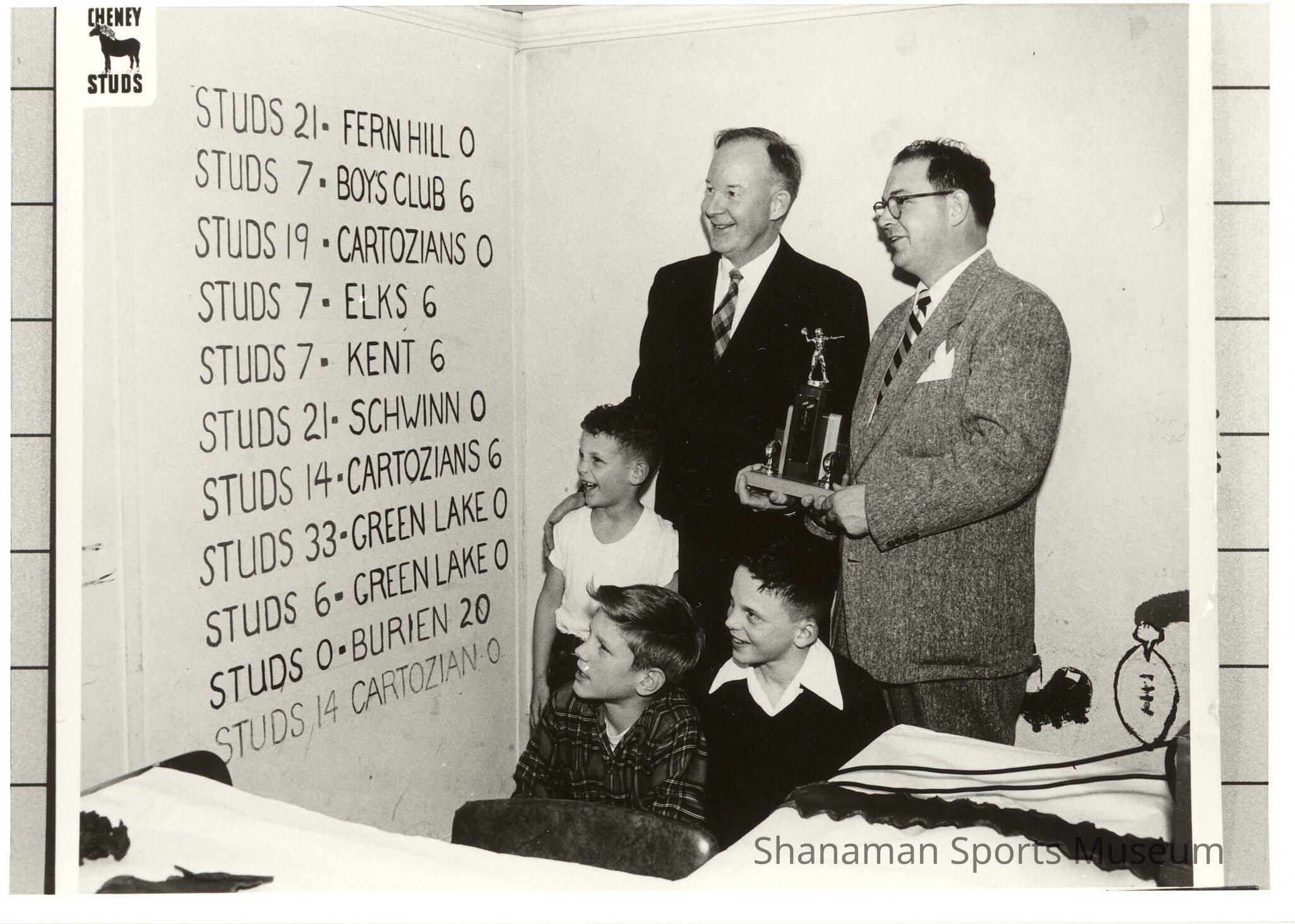 Three youths and two adults, all unidentified, look at the scores from 10 games for the Cheney Studs youth football team. The Studs were 9-1 in those 10 games, outscoring opponents, 149-44. The team was sponsored by Cheney Lumber Company, which was founded in 1936 by Brad Cheney.Lexicon