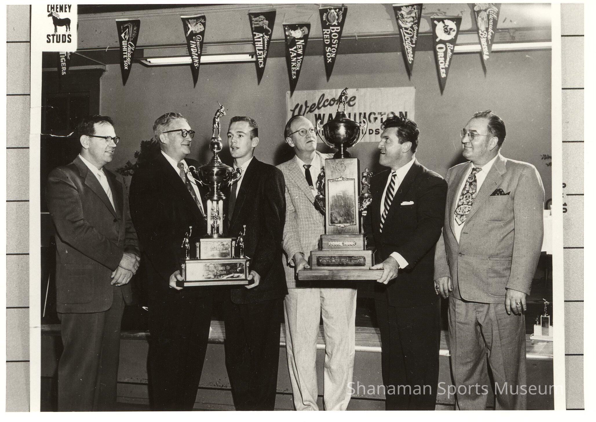 Photo of six gentlemen holding trophies. Washington Amateur Baseball Assoc. c.1957--1960
