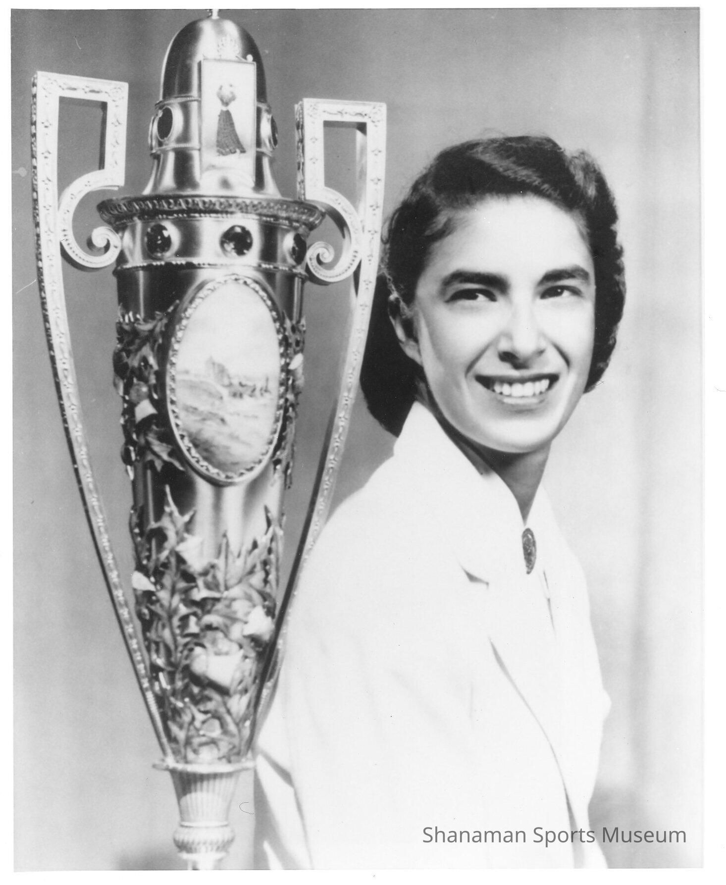 Pat Harbottle smiles for a photo as she sits next to a golf tournament trophy she won. Harbottle was no stranger to winning golf tournaments. At just 14, she won her first Seattle Women's City titles and came back to win it the next year. In 1952, she won an impressive string of tournaments, winning the Pacific Northwest, the Washington Amateur, the Oregon Amateur and NCAA titles. After she married John Harbottle in 1957, she won the PNGA title in 1965 and the Washington State championship in 1974. she was inducted into the PNGA Hall of Fame in 1985 and the State of Washington Sports Hall of Fame in 1999 and Tacoma-Pierce County Sports Hall of Fame in 2005.Lexicon