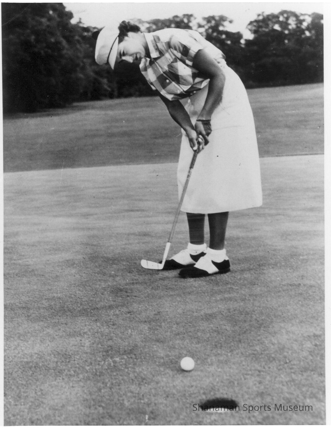 Pat Harbottle practices her putting in preparation for another tournament. At just 14, Harbottle won her first of two consecutive Seattle Women's City titles. In 1952, she strung together some impressive wins as she won the Pacific Northwest, the Washington Amateur and the Oregon Amateur and NCAA titles. She was inducted into the PNGA Hall of Fame in 1985. While attending Seattle University in the mid 1950s, Harbottle became the first female to play on a college men's team.Lexicon