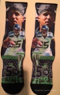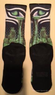 The pair of socks feature former Seattle Seahawks wide receiver Jermaine Kearse in an action shot, in front of a background of a close up shot of Kearse. Jermaine Kearse, who attended the University of Washington, played in 69 games for the Seahawks, hauling in 153 receptions, turning 17of them into touchdowns. Kearse was also a key part of the 2013-14 Seahawks that won Super Bowl 48. Towards the bottom of the sock there is a close up shot of the eye in the Seahawk logo, with a neon green outline of the Space needle and surrounding buildings, with the phrase “15 to 1”* across the bottom of where the ankle would be. The sock was donated by the Kearse foundation, and dates back to 2014.Lexicon