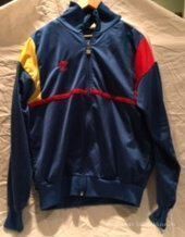 A blue Tacoma Stars warm-up suit with red and yellow trim, believed to be from the 1987 season.