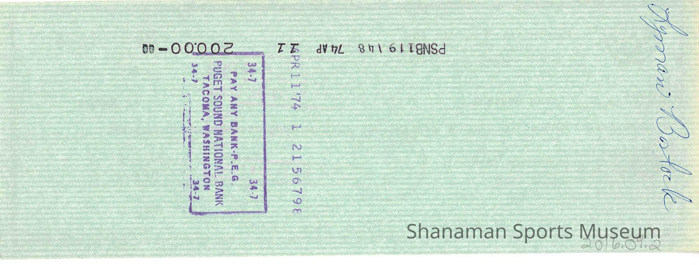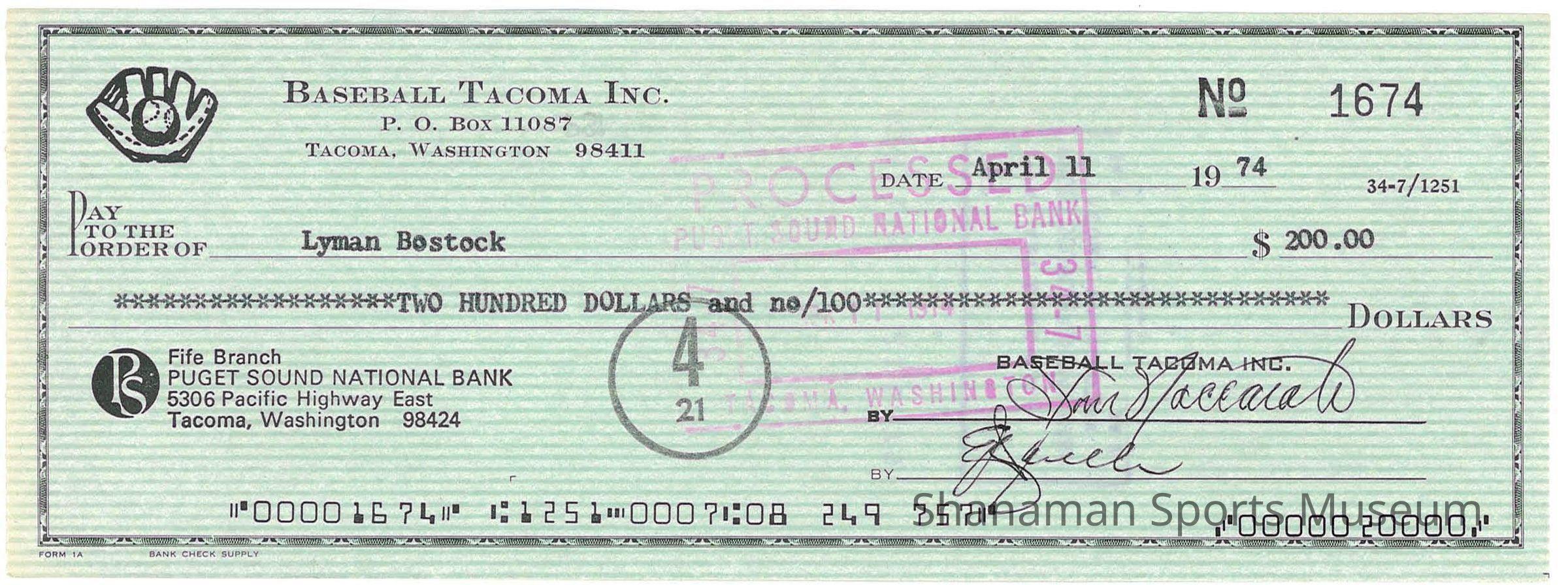 This is a cashed check made out to Lyman Bostock for $200 from Baseball Tacoma Inc., dated April 11, 1974.