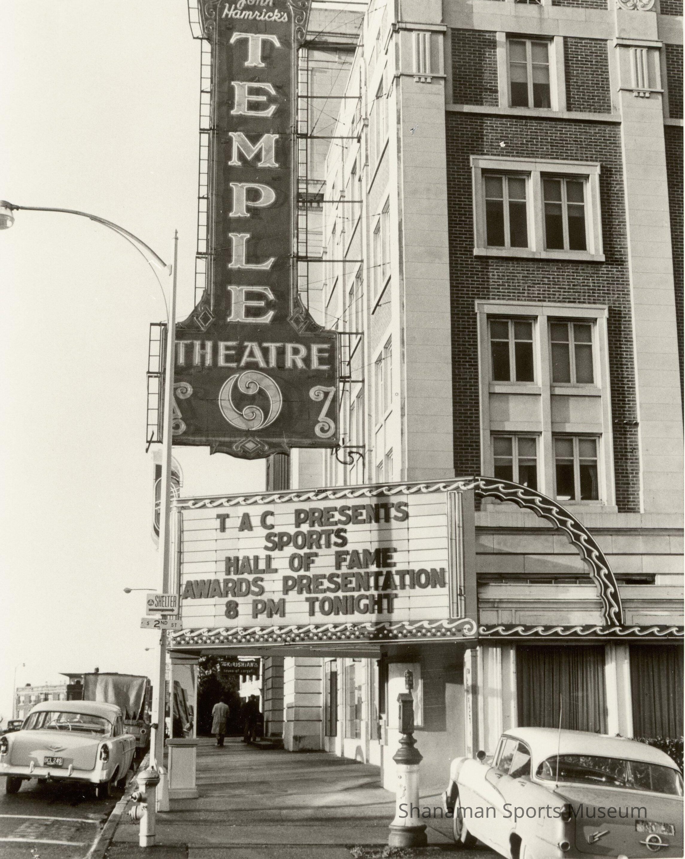The marquee of John Hamrick's Temple Theater, 47 Saint Helens Avenue in Tacoma, advertises the Tacoma Athletic Commission presenting the Sports Hall of Fame Awards Presentation in a photograph believed to have been taken in the late 1950s.