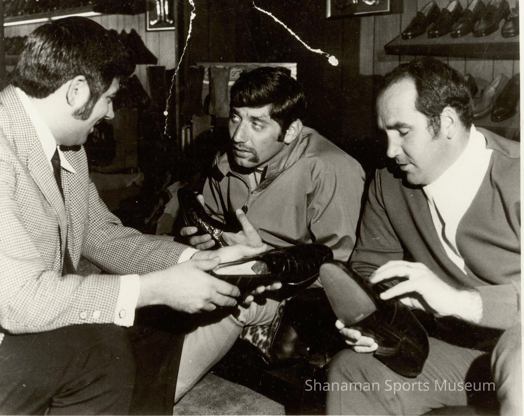 Tacoma businessman Joe Malcuso, left, shows shoes to New York Jets quarterback Joe Namath and San Diego Chargers quarterback John Hadl when the Pro Bowl plauers visited Tacoma in 1969. Namath and Hadl, each of whom led both the NFL and AFL in passing yards for at least one season, were in town to speak at the State of Washington Sports Hall of Fame induction ceremony.Lexicon