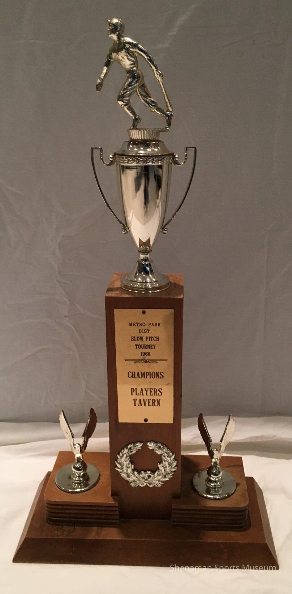 Players Tavern won this trophy when they won the 1966 Metro Park District slowpitch tournament. Players Tavern was one of the best slowpitch teams to play in Tacoma. But no Tacoma softball team dominated like the Heidelberg Beer slowpitch team. Between 1968 and 1997, the team compiled an impressive 1,368-44 record and they won 17 Washington regional and state titles. They also went 11 years without losing a Washington State Church A Tournament. As manager of Heidelberg Beer softball team, Steve Shackett was inducted into three All-World teams as manager. Dick Zierman, who donated this trophy, was a top notched player for the Players Tavern team and was named to 14 all-star teams as a player. He also coached and played recreation football and won five league championships. Zierman, who was a three-sport starter at Lincoln High School, also played on Western State's 1972's County League basketball championship team.Lexicon