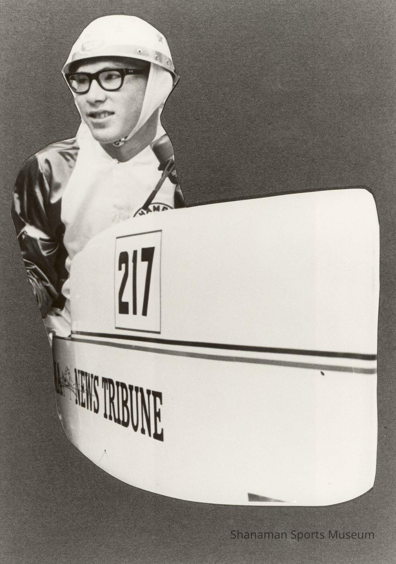 Wearing his helmet, Greg Schumacher sits in his homemade soap box derby racer that he won the 1964 All-America Soap Box Derby in Akron, Ohio. Schumacher, who is from Tacoma, became the first racer from Washington to win the national championship that draws contestants from across the country. The national Soap Box Derby began in 1934 in Akron, Ohio, and was held every year until the start of World War II and was postponed four years and resumed in Akron in 1946. Until 1971, the Soap Box Derby was opened only to boys.Lexicon