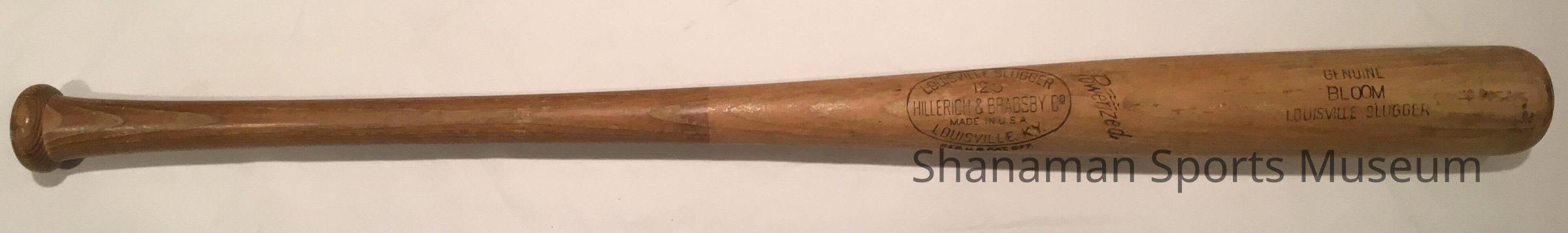 Baseball Bat, Louisville Slugger with "Bloom" on barrel. Used by Dale Bloom while playing with the Tri-City Braves in 1953-1954.
