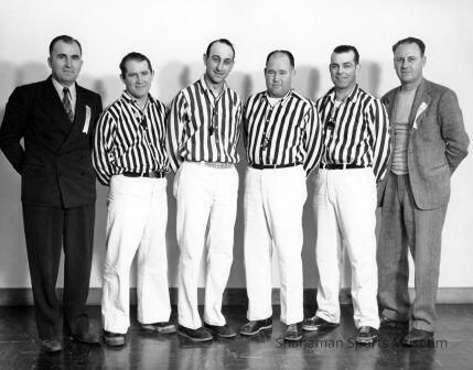 Several referees posing together before a basketball game. In the photo are Ray Croxell, third from left, John Kennedy, second right, and Chet Bardwell, far right.