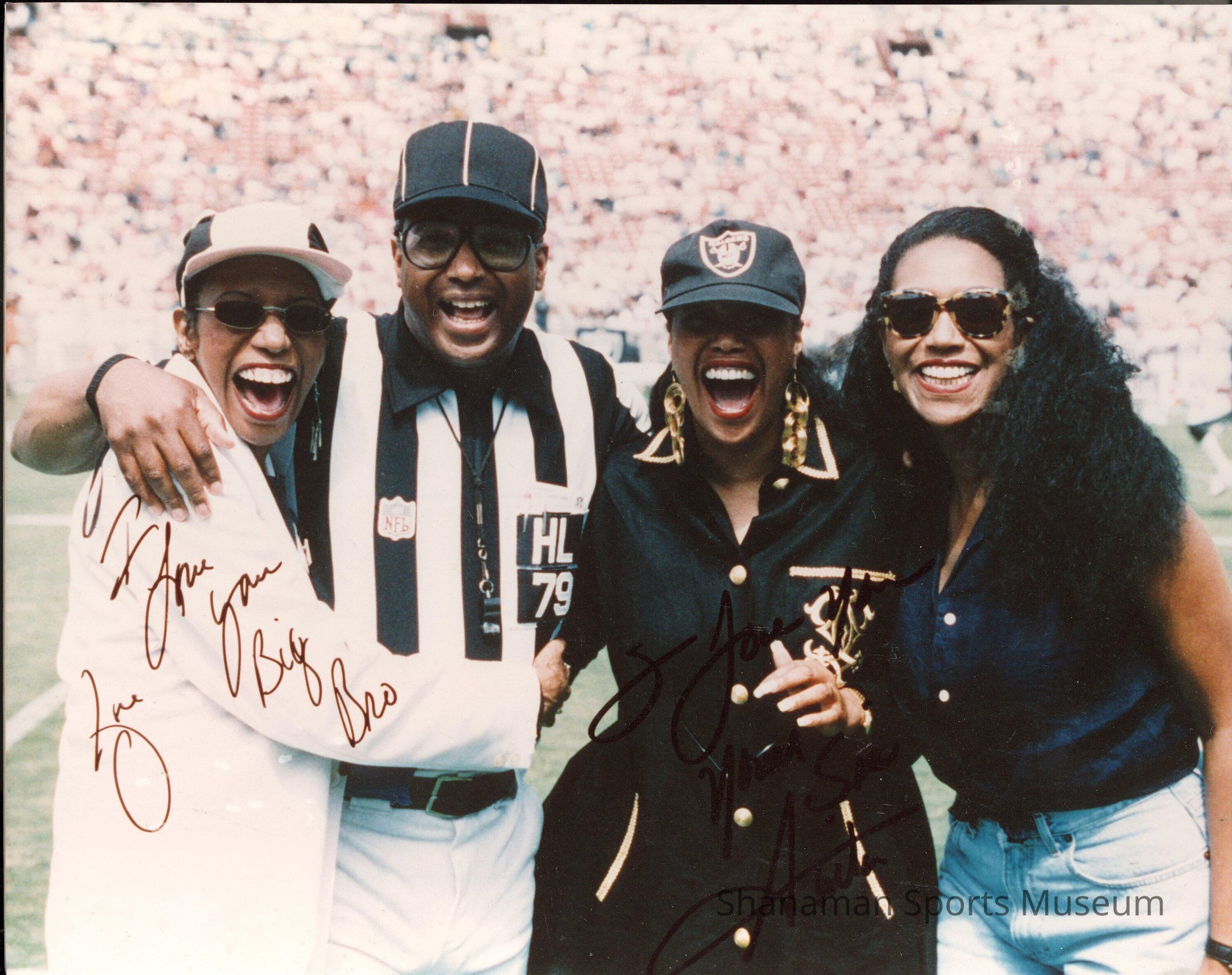 Aaron Pointer, who was a head linesman ref in the NFL from 1978 to 1987, stands smiling prior to an NFL game with his famous sisters, the Pointer Sisters.” Before he became a NFL ref, Pointer played pro baseball for 10 years, helping the 1969 Tacoma Cubs win the Pacific Coast League championship. In 1961, Pointer hit .402 in the minor leagues for Class A Salisbury in the Western Carolina League. He's the last player to bat over .400 for a season. He batted .208 over three seasons with the Houston Astros. After baseball, he began officiating at the recreation level in 1971 and moved up to high school and college. He joined the NFL in 1987 and retired in 2003. The Pointer Sisters won three Grammy Awards and received a star on the Hollywood Walk of Fame in 1994. They had 13 top 20 hits between 1973 and 1985. Pointer, who was born in Little Rock, Arkansas in 1942, was inducted into the Tacoma Hall of Fame in 2008.Lexicon